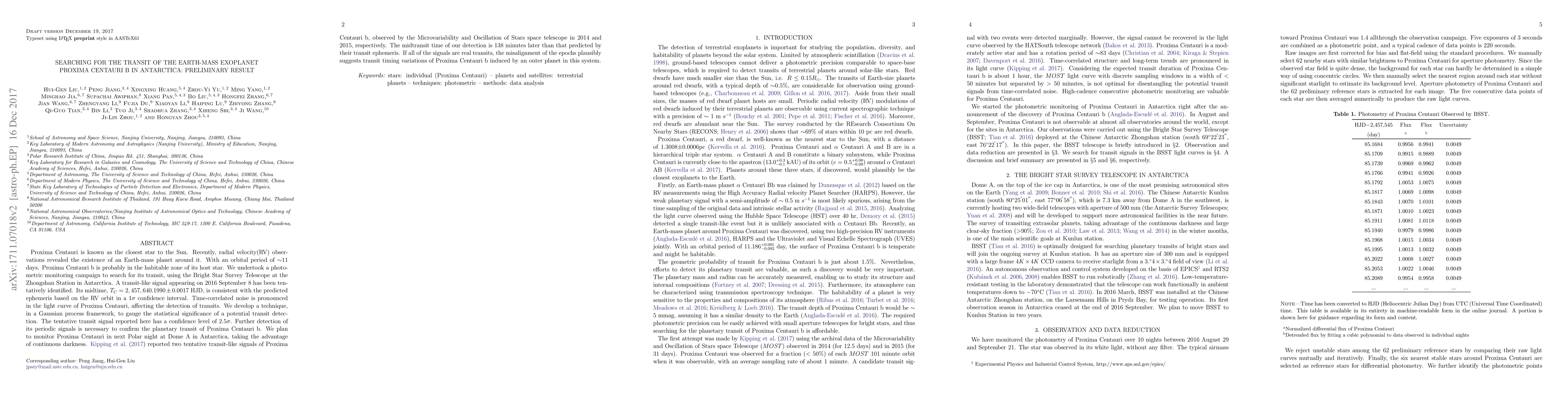 Researchers have conducted photometric monitoring in Antarctica to search for the transit of Proxima Centauri b, an Earth-mass planet with a potentially habitable surface. A tentative transit signal was detected on September 8, 2016, with a confidence level of 2.5σ, though further observations are needed to confirm this detection.