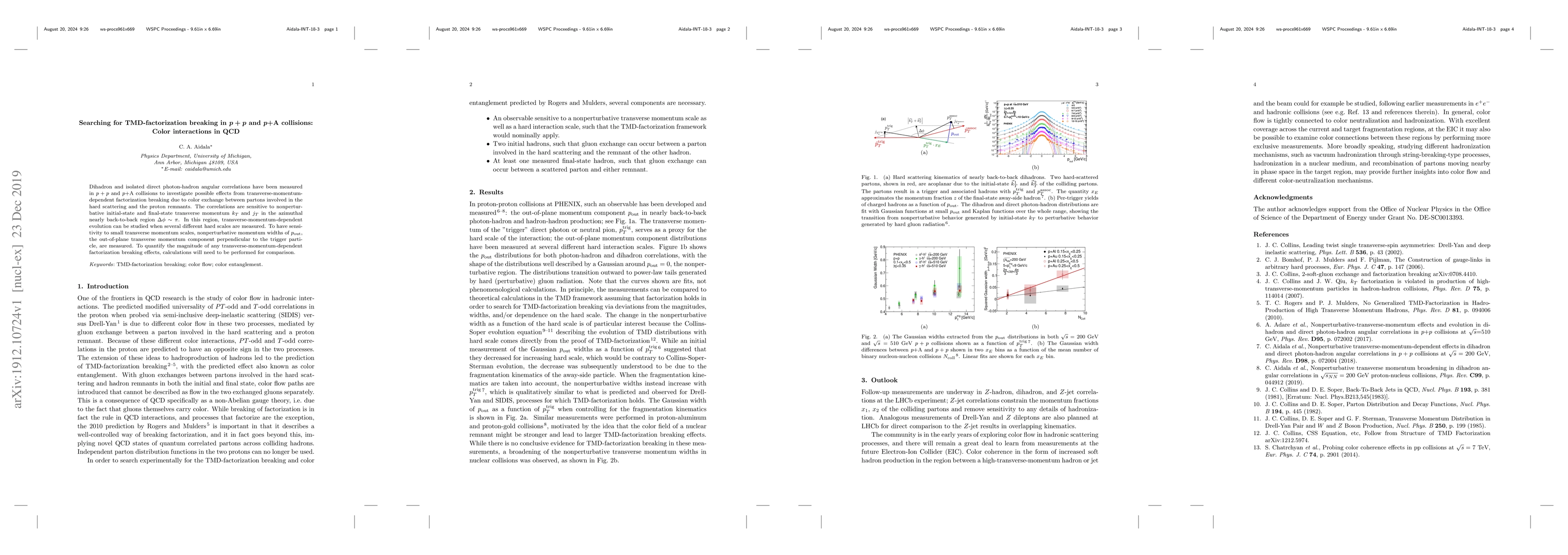 Dihadron and isolated direct photon-hadron angular correlations have been measured in $p$+$p$ and $p$+A collisions to investigate possible effects from transverse-momentum-dependent factorization breaking due to color exchange between partons involved in the hard scattering and the proton remnants. The correlations are sensitive to nonperturbative initial-state and final-state transverse momentum $k_T$ and $j_T$ in the azimuthal nearly back-to-back region $\Delta \phi \sim \pi$. In this region, transverse-momentum-dependent evolution can be studied when several different hard scales are measured. To have sensitivity to small transverse momentum scales, nonperturbative momentum widths of \pout, the out-of-plane transverse momentum component perpendicular to the trigger particle, are measured. To quantify the magnitude of any transverse-momentum-dependent factorization breaking effects, calculations will need to be performed for comparison.