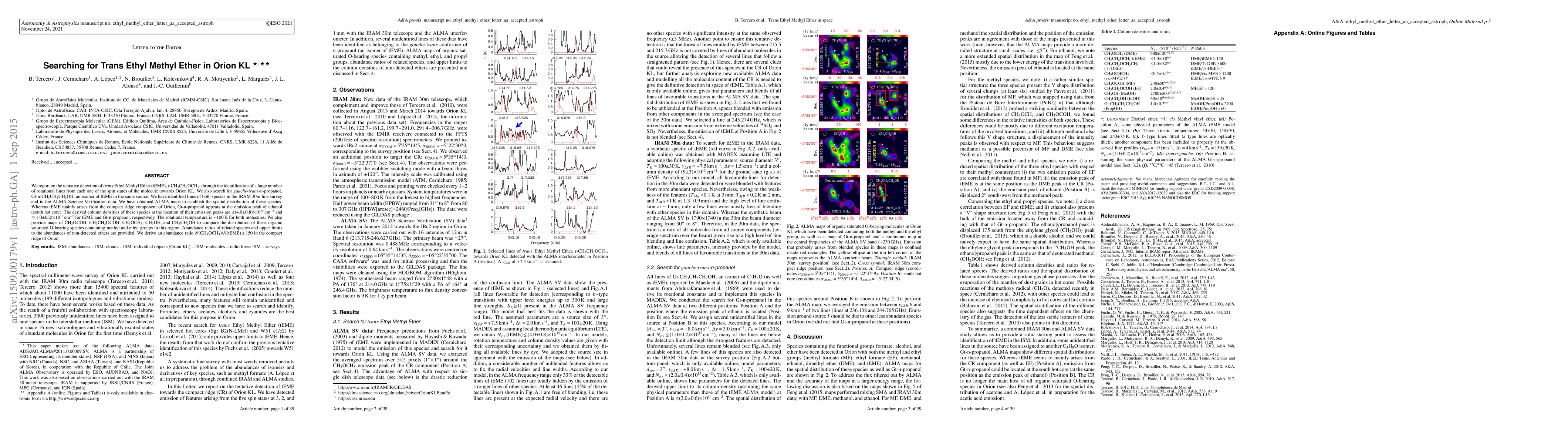 This paper reports the tentative detection of $trans$ Ethyl Methyl Ether (tEME) in Orion KL, identifying its rotational lines and mapping its spatial distribution, primarily in the compact ridge. It also detects $gauche$-$trans$-n-propanol in the south hot core, providing abundance ratios and upper limits for related organic molecules.