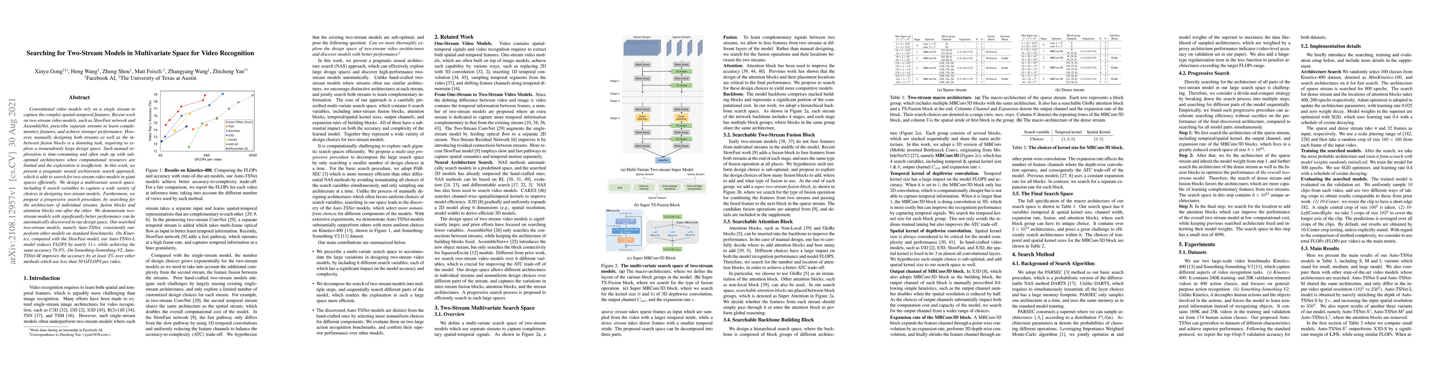 Conventional video models rely on a single stream to capture the complex spatial-temporal features. Recent work on two-stream video models, such as SlowFast network and AssembleNet, prescribe separate streams to learn complementary features, and achieve stronger performance. However, manually designing both streams as well as the in-between fusion blocks is a daunting task, requiring to explore a tremendously large design space. Such manual exploration is time-consuming and often ends up with sub-optimal architectures when computational resources are limited and the exploration is insufficient. In this work, we present a pragmatic neural architecture search approach, which is able to search for two-stream video models in giant spaces efficiently. We design a multivariate search space, including 6 search variables to capture a wide variety of choices in designing two-stream models. Furthermore, we propose a progressive search procedure, by searching for the architecture of individual streams, fusion blocks, and attention blocks one after the other. We demonstrate two-stream models with significantly better performance can be automatically discovered in our design space. Our searched two-stream models, namely Auto-TSNet, consistently outperform other models on standard benchmarks. On Kinetics, compared with the SlowFast model, our Auto-TSNet-L model reduces FLOPS by nearly 11 times while achieving the same accuracy 78.9%. On Something-Something-V2, Auto-TSNet-M improves the accuracy by at least 2% over other methods which use less than 50 GFLOPS per video.