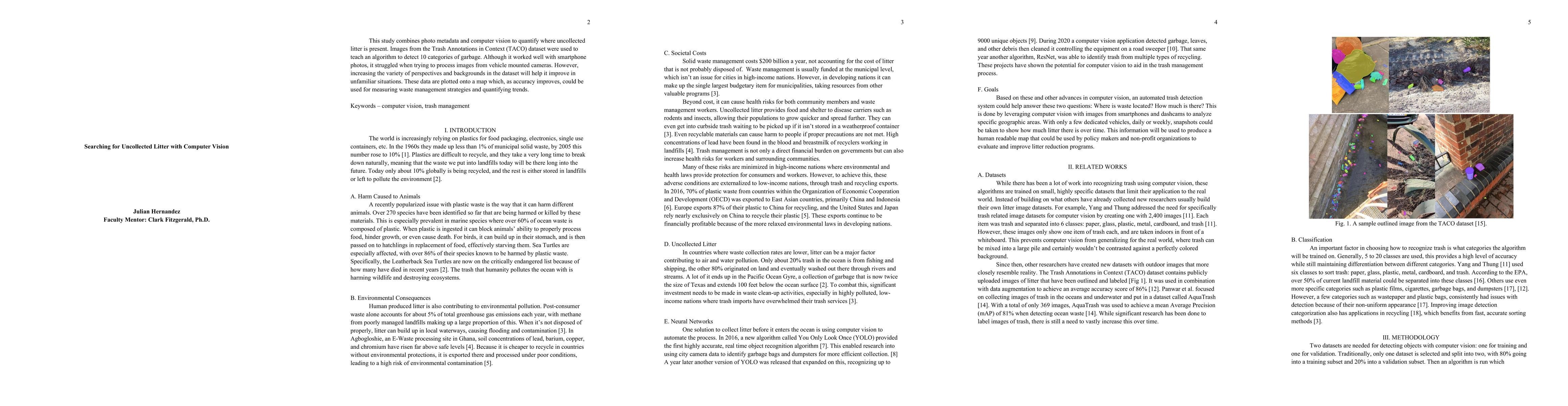 This study uses computer vision and photo metadata to detect and quantify uncollected litter, successfully identifying 10 garbage categories from smartphone photos but facing challenges with vehicle-mounted camera images. Enhanced dataset diversity is expected to improve performance in varied contexts.
