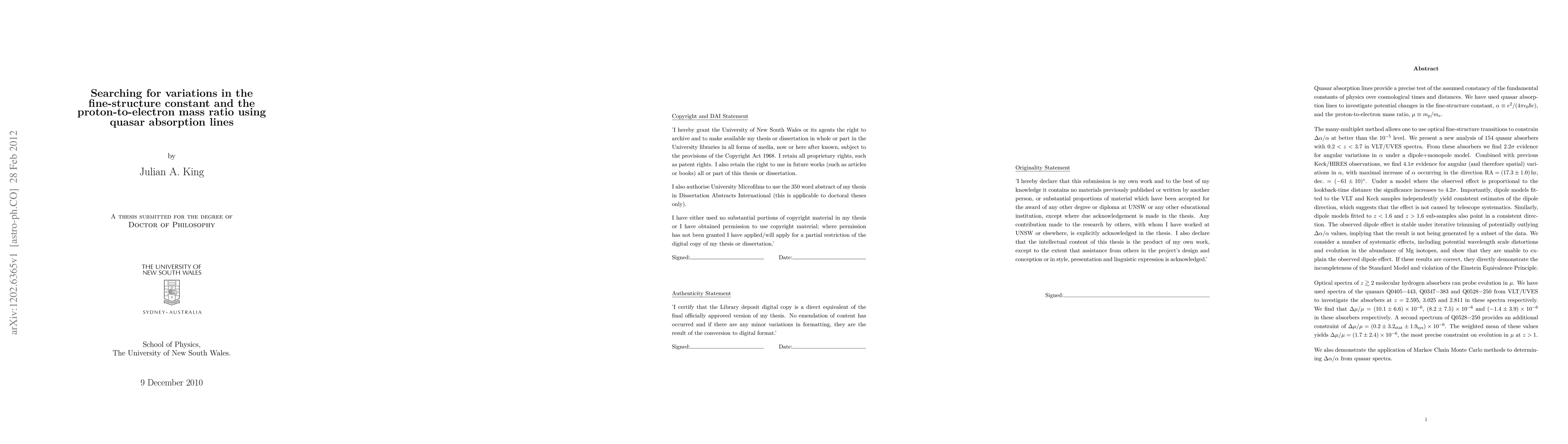 (abridged) Quasar absorption lines provide a precise test of the assumed constancy of the fundamental constants of physics. We have investigated potential changes in the fine-structure constant, alpha, and the proton-to-electron mass ratio, mu. The many-multiplet method allows one to use optical fine-structure transitions to constrain (Delta alpha)/alpha at better than the 10^(-5) level. We present a new analysis of 154 quasar absorbers with 0.2 < z <3.7 in VLT/UVES spectra. From these absorbers we find 2.2 sigma evidence for angular variations in alpha under a dipole+monopole model. Combined with previous Keck/HIRES observations, we find 4.1 sigma evidence for angular (and therefore spatial) variations in alpha, with maximal increase of alpha occurring in the direction RA=(17.3 +/- 1.0) hr, dec=(-61 +/- 10) deg. Under a model where the observed effect is proportional to the lookback-time distance the significance increases to 4.2 sigma. Dipole models fitted to the VLT and Keck samples and models fitted to z<1.6 and z>1.6 sub-samples independently yield consistent estimates of the dipole direction, which suggests that the effect is not caused by telescope systematics. We consider a number of systematic effects and show that they are unable to explain the observed dipole effect. We have used spectra of the quasars Q0405-443, Q0347-383 and Q0528-250 from VLT/UVES to investigate the absorbers at z=2.595, 3.025 and 2.811 in these spectra respectively. We find that (Delta mu)/mu=(10.1 +/- 6.6) x 10^(-6), (8.2 +/- 7.5) x 10^(-6) and (-1.4 +/- 3.9) x 10^(-6) in these absorbers respectively. A second spectrum of Q0528-250 provides an additional constraint of (Delta mu)/mu=(0.2 +/- 3.2_stat +/- 1.9_sys) x 10^(-6). The weighted mean of these values yields (Delta mu)/mu=(1.7 +/- 2.4) x 10^(-6), the most precise constraint on evolution in mu at z>1.