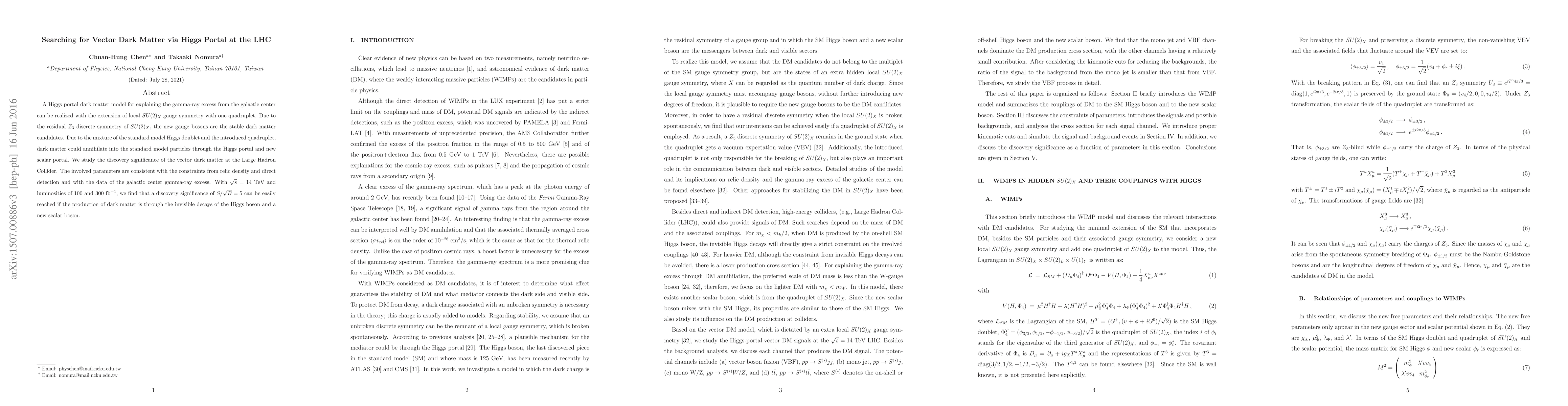 This paper explores a Higgs portal dark matter model with vector dark matter candidates arising from an extended $SU(2)_X$ gauge symmetry. It predicts that the Large Hadron Collider could detect these dark matter particles through invisible decays of the Higgs and a new scalar, achieving a discovery significance of $S/\sqrt{B}=5$ with sufficient luminosity.