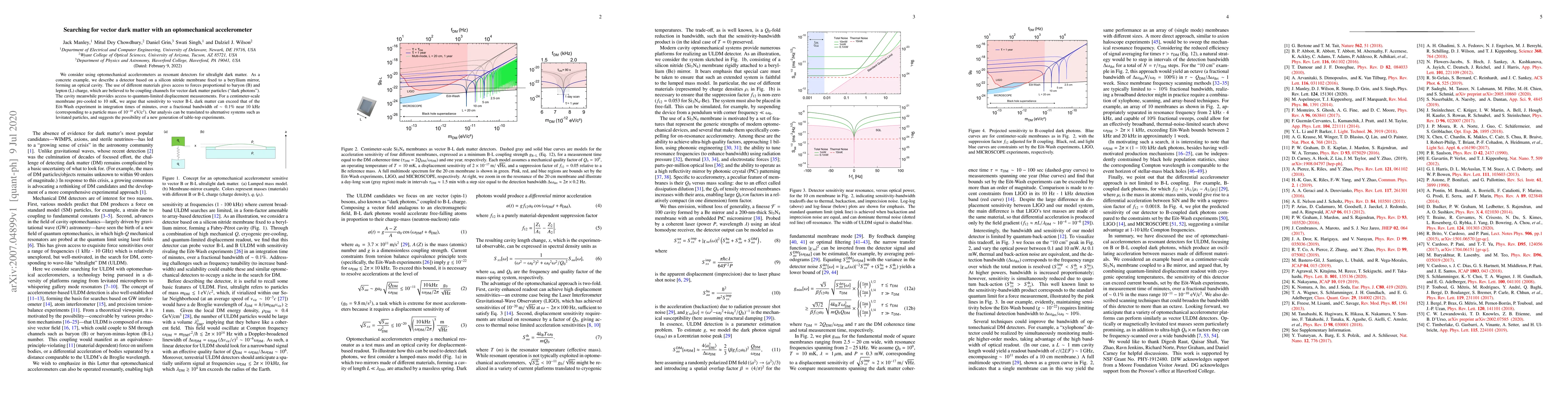 We consider using optomechanical accelerometers as resonant detectors for ultralight dark matter. As a concrete example, we describe a detector based on a silicon nitride membrane fixed to a beryllium mirror, forming an optical cavity. The use of different materials gives access to forces proportional to baryon (B) and lepton (L) charge, which are believed to be coupling channels for vector dark matter particles ("dark photons"). The cavity meanwhile provides access to quantum-limited displacement measurements. For a centimeter-scale membrane pre-cooled to 10 mK, we argue that sensitivity to vector B-L dark matter can exceed that of the E\"{o}t-Wash experiment in integration times of minutes, over a fractional bandwidth of $\sim 0.1\%$ near 10 kHz (corresponding to a particle mass of $10^{-10}$eV/c$^2$). Our analysis can be translated to alternative systems such as levitated particles, and suggests the possibility of a new generation of table-top experiments.