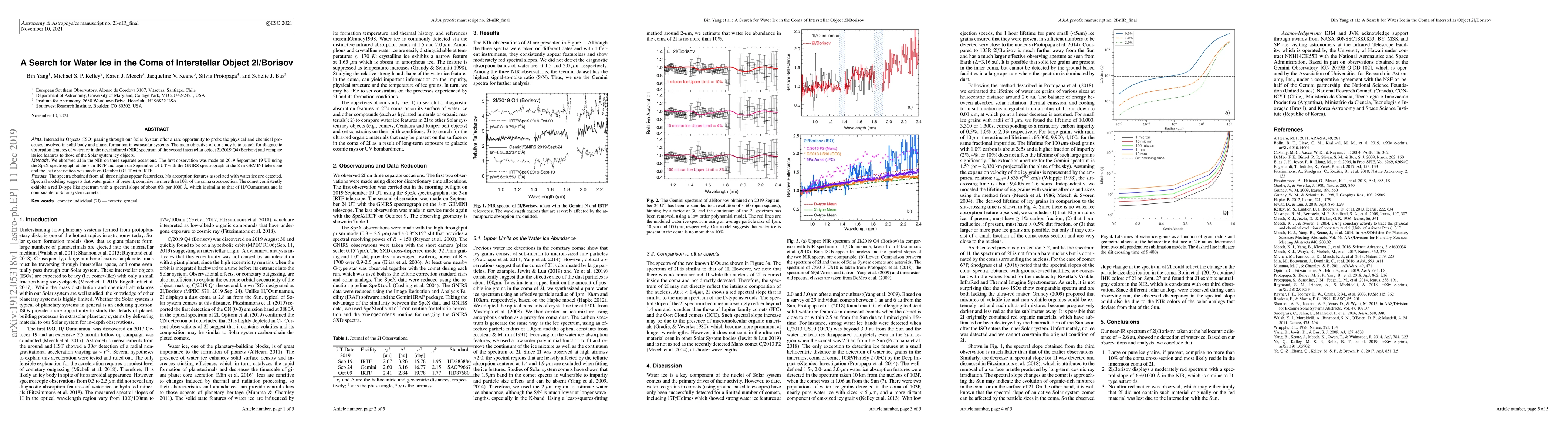 A study of interstellar object 2I/Borisov's coma searched for water ice absorption features in its near-infrared spectrum, finding none, suggesting water grains comprise less than 10% of the coma cross-section.
