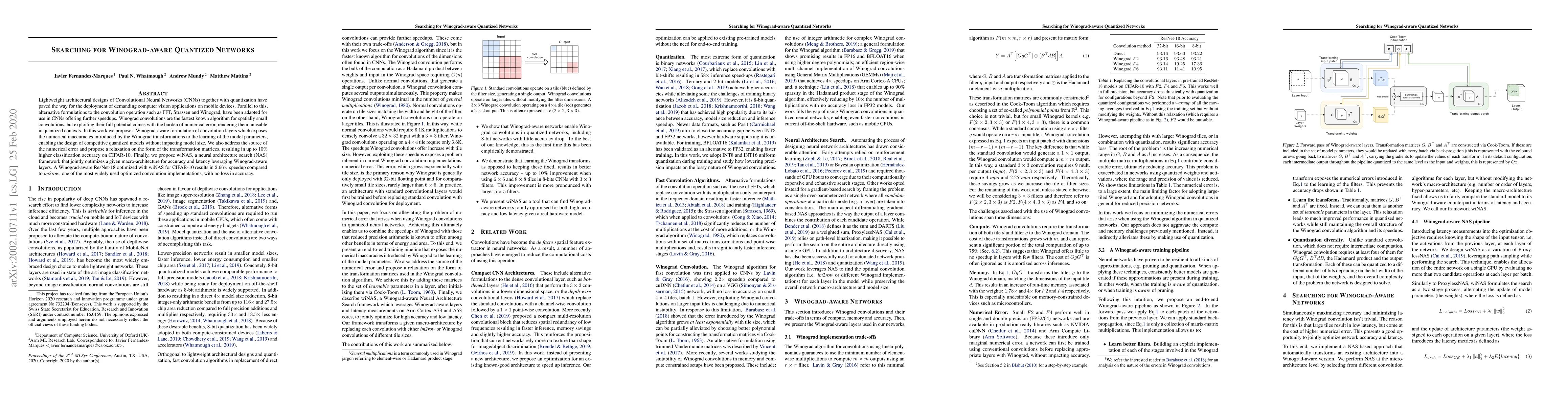 Lightweight architectural designs of Convolutional Neural Networks (CNNs) together with quantization have paved the way for the deployment of demanding computer vision applications on mobile devices. Parallel to this, alternative formulations to the convolution operation such as FFT, Strassen and Winograd, have been adapted for use in CNNs offering further speedups. Winograd convolutions are the fastest known algorithm for spatially small convolutions, but exploiting their full potential comes with the burden of numerical error, rendering them unusable in quantized contexts. In this work we propose a Winograd-aware formulation of convolution layers which exposes the numerical inaccuracies introduced by the Winograd transformations to the learning of the model parameters, enabling the design of competitive quantized models without impacting model size. We also address the source of the numerical error and propose a relaxation on the form of the transformation matrices, resulting in up to 10% higher classification accuracy on CIFAR-10. Finally, we propose wiNAS, a neural architecture search (NAS) framework that jointly optimizes a given macro-architecture for accuracy and latency leveraging Winograd-aware layers. A Winograd-aware ResNet-18 optimized with wiNAS for CIFAR-10 results in 2.66x speedup compared to im2row, one of the most widely used optimized convolution implementations, with no loss in accuracy.