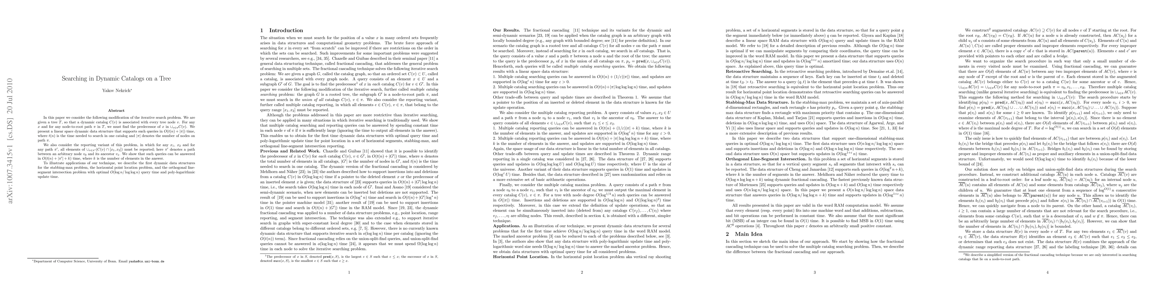 In this paper we consider the following modification of the iterative search problem. We are given a tree $T$, so that a dynamic catalog $C(v)$ is associated with every tree node $v$. For any $x$ and for any node-to-root path $\pi$ in $T$, we must find the predecessor of $x$ in $\cup_{v\in \pi} C(v)$. We present a linear space dynamic data structure that supports such queries in $O(t(n)+|\pi|)$ time, where $t(n)$ is the time needed to search in one catalog and $|\pi|$ denotes the number of nodes on path $\pi$. We also consider the reporting variant of this problem, in which for any $x_1$, $x_2$ and for any path $\pi'$ all elements of $\cup_{v\in \pi'} (C(v)\cap [x_1,x_2])$ must be reported; here $\pi'$ denotes a path between an arbitrary node $v_0$ and its ancestor $v_1$. We show that such queries can be answered in $O(t(n)+|\pi'|+ k)$ time, where $k$ is the number of elements in the answer. To illustrate applications of our technique, we describe the first dynamic data structures for the stabbing-max problem, the horizontal point location problem, and the orthogonal line-segment intersection problem with optimal $O(\log n/\log \log n)$ query time and poly-logarithmic update time.