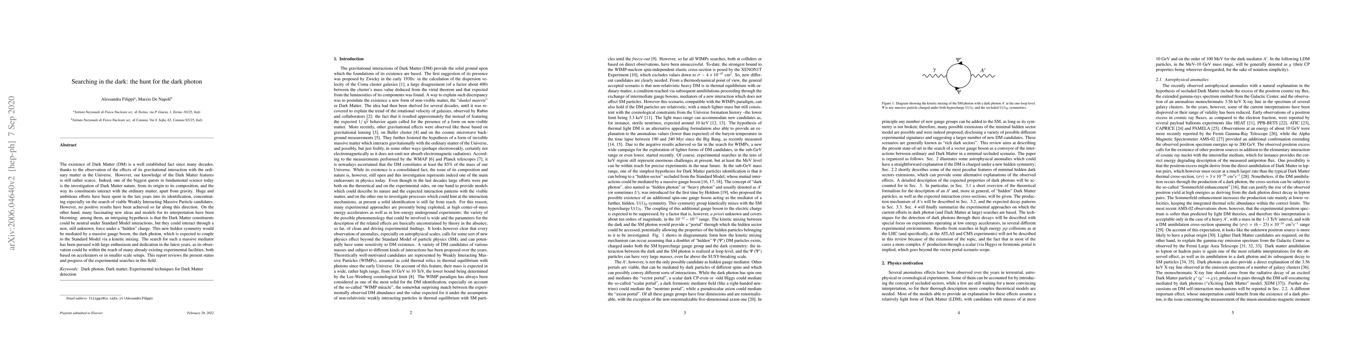 The existence of Dark Matter (DM) is a well established fact since many decades, thanks to the observation of the effects of its gravitational interaction with the ordinary matter in the Universe. However, our knowledge of the Dark Matter features is still rather scarce. Indeed, one of the biggest quests in fundamental science today is the investigation of Dark Matter nature, from its origin to its composition, and the way its constituents interact with the ordinary matter, apart from gravity. Huge and ambitious efforts have been spent in the last years into its identification, concentrating especially on the search of viable Weakly Interacting Massive Particle candidates. However, no positive results have been achieved so far along this direction. On the other hand, many fascinating new ideas and models for its interpretation have been blooming: among them, an intriguing hypothesis is that the Dark Matter constituents could be neutral under Standard Model interactions, but they could interact through a new, still unknown, force under a "hidden" charge. This new hidden symmetry would be mediated by a massive gauge boson, the dark photon, which is expected to couple to the Standard Model via a kinetic mixing. The search for such a massive mediator has been pursued with large enthusiasm and dedication in the latest years, as its observation could be within the reach of many already existing experimental facilities, both based on accelerators