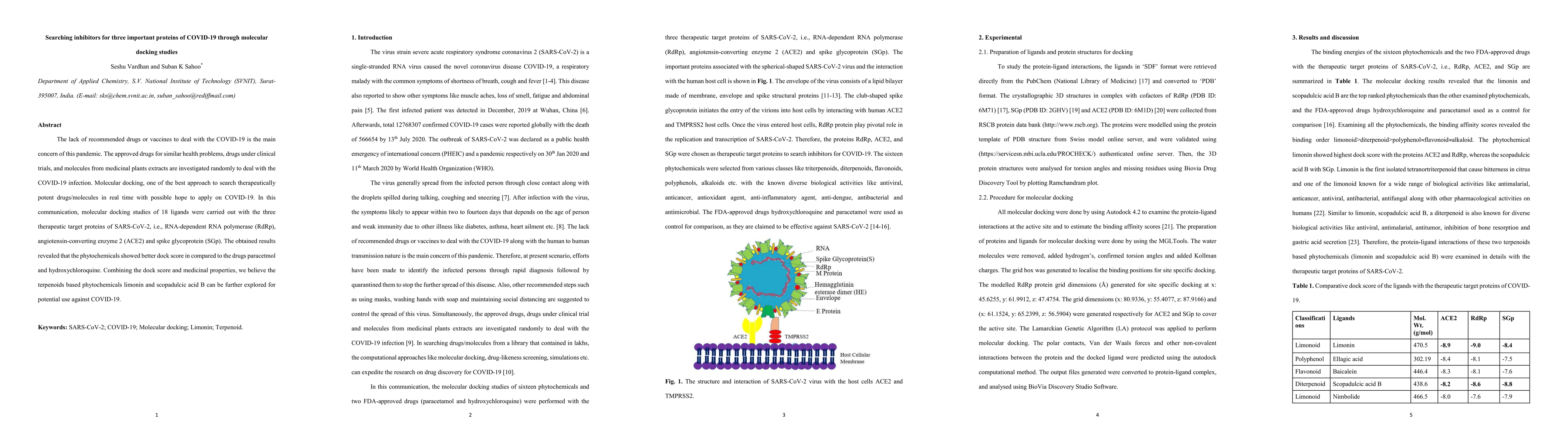 Researchers used molecular docking to identify potential inhibitors for COVID-19 proteins, finding that phytochemicals like limonin and scopadulcic acid B showed promise in combating the virus.