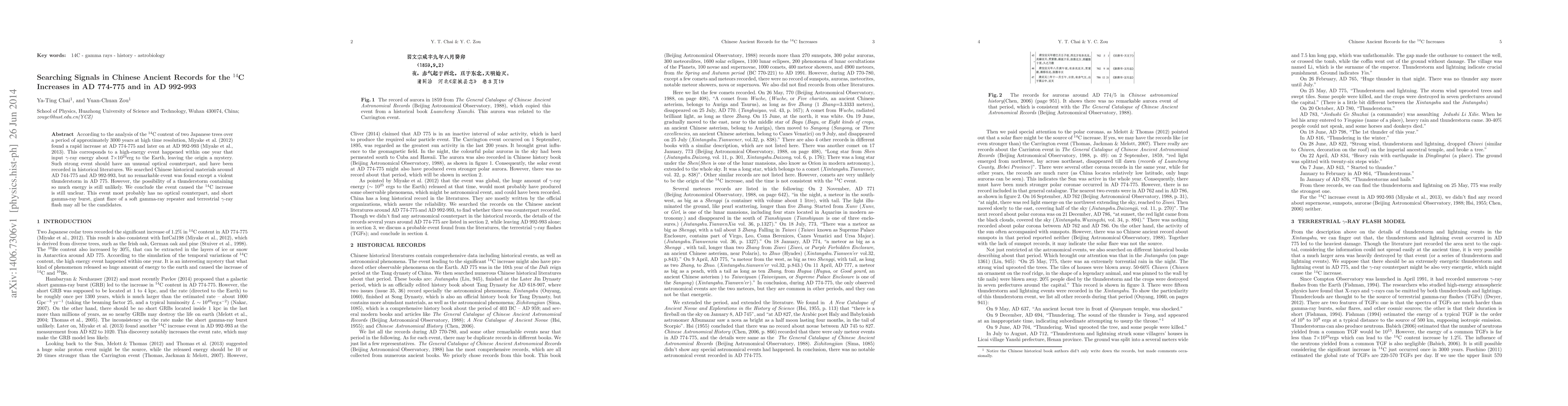 According to the analysis of the $^{14}$C content of two Japanese trees over a period of approximately 3000 years at high time resolution, Miyake (2012) found a rapid increase at AD 774-775 and later on at AD 992-993 (Miyake 2013). This corresponds to a high-energy event happened within one year that input $\gamma$-ray energy about 7$\times{}$10$^{24}$erg to the Earth, leaving the origin a mystery. Such strong event should have an unusual optical counterpart, and have been recorded in historical literature. We searched Chinese historical materials around AD 744-775 and AD 992-993, but no remarkable event was found except a violent thunderstorm in AD 775. However, the possibility of a thunderstorm containing so much energy is still unlikely. We conclude the event caused the $^{14}$C increase is still unclear. This event most probably has no optical counterpart, and short gamma-ray burst, giant flare of a soft gamma-ray repeater and terrestrial $\gamma$-ray flash may all be the candidates.