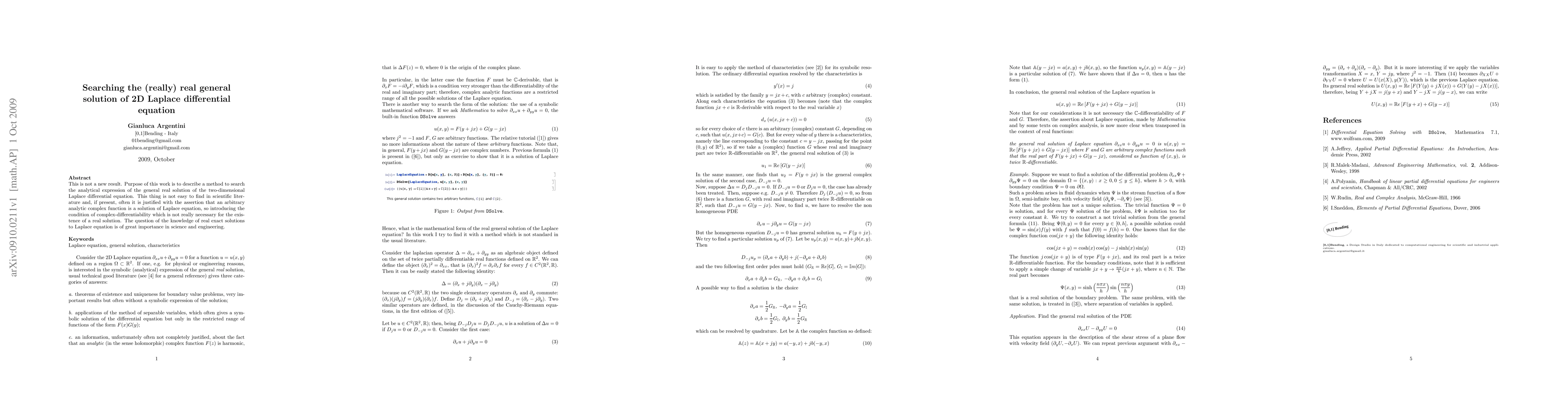 This paper presents a method to derive the analytical expression for the general real solution of the 2D Laplace differential equation, emphasizing the importance of real solutions over complex-differentiability in scientific and engineering applications. The work aims to fill a gap in literature where real solutions are often overlooked.
