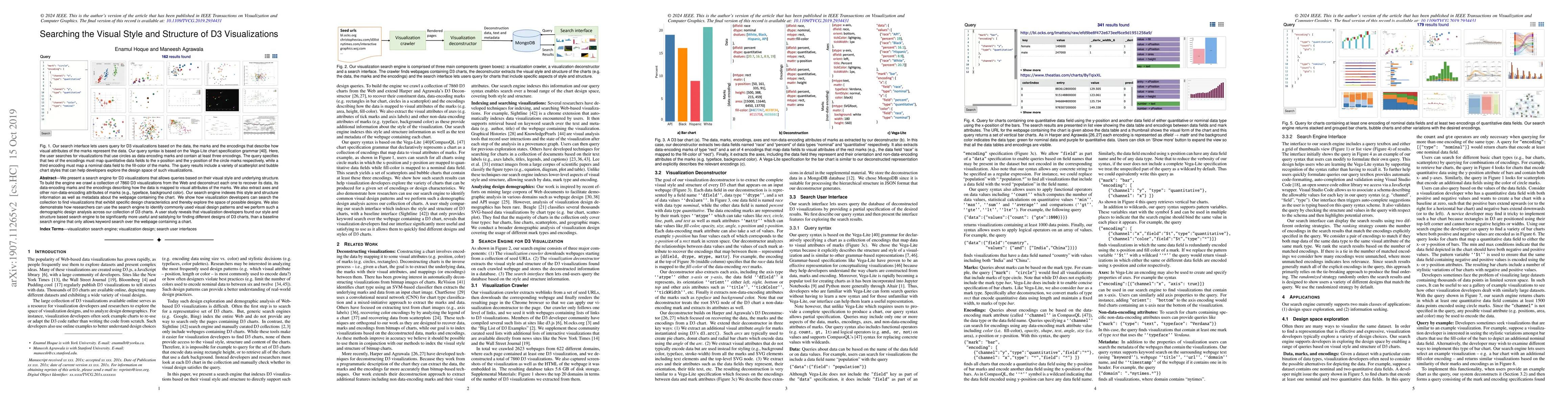 This paper introduces a search engine for D3 visualizations that enables querying based on visual style and structure. The engine indexes visual style and structural data from a collection of 7860 D3 charts, allowing developers to explore design patterns and find specific design characteristics more effectively than traditional keyword searches.