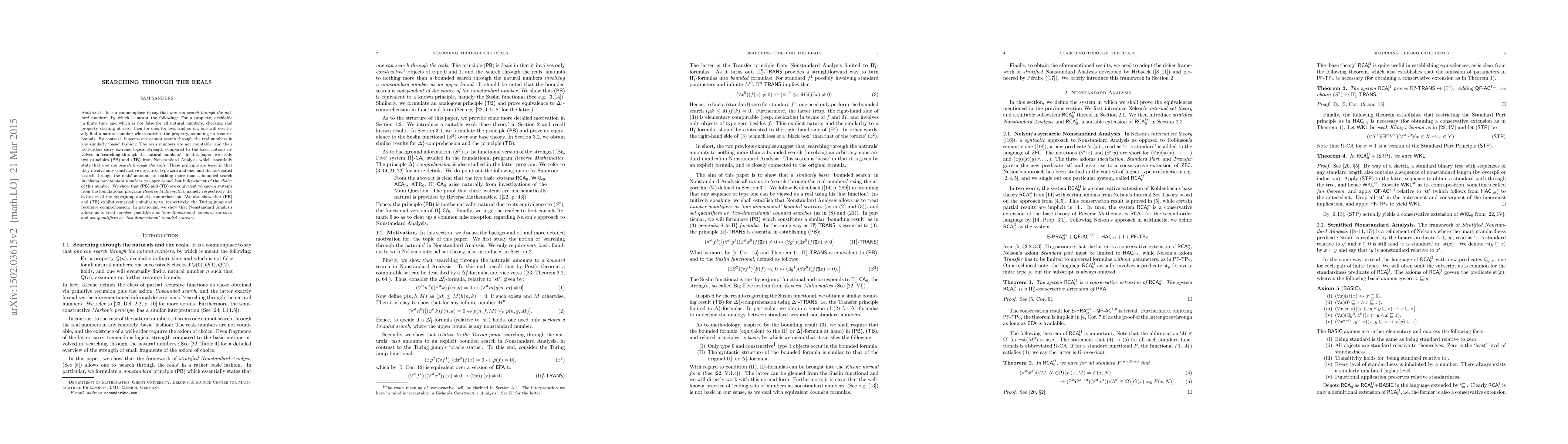 It is a commonplace to say that `one can search through the natural numbers', by which is meant the following: For a property, decidable in finite time and which is not false for all natural numbers, checking said property starting at zero, then for one, for two, and so on, one will eventually find a natural number which satisfies the property, assuming no resource bounds. By contrast, it seems one cannot search through the real numbers in any similarly `basic' fashion: The reals numbers are not countable, and their well-orders carry extreme logical strength compared to the basic notions involved in `searching through the natural numbers'. In this paper, we study two principles (PB) and (TB) from Nonstandard Analysis which essentially state that `one can search through the reals'. These principle are basic in that they involve only constructive objects of type zero and one, and the associated `search through the reals' amounts to nothing more than a bounded search involving nonstandard numbers as upper bound, but independent of the choice of this number. We show that (PB) and (TB) are equivalent to known systems from Reverse Mathematics, namely respectively the existence of the hyperjump and $\Delta_{1}^{1}$-comprehension. We also show that (PB) and (TB) exhibit remarkable similarity to, respectively,the Turing jump and recursive comprehension. In particular, we show that Nonstandard Analysis allows us to treat number quantifiers as `one-dimensional' bounded searches, and set quantifiers as `two-dimensional' bounded searches.