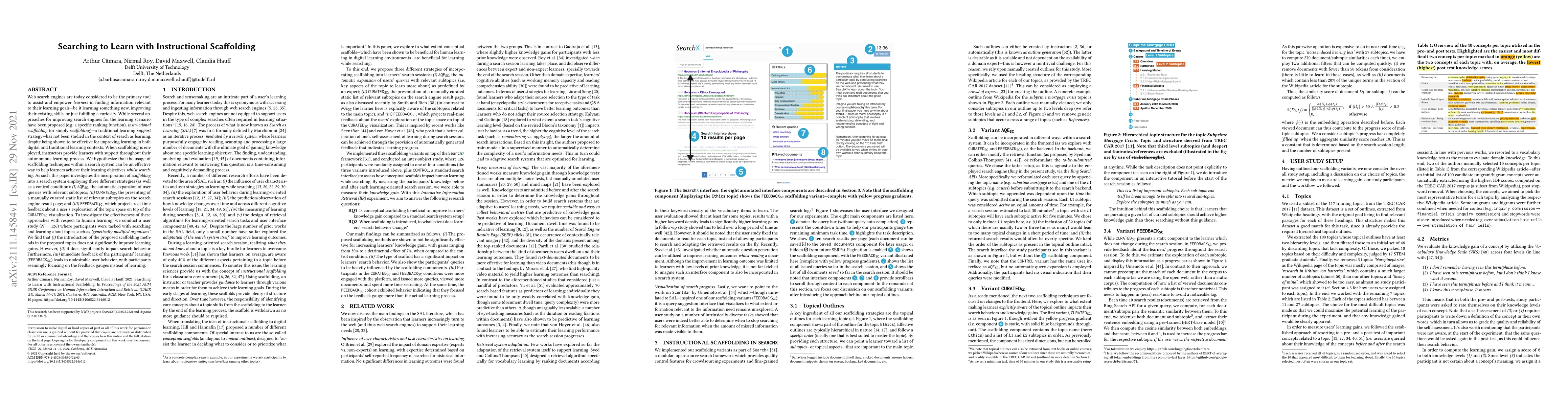 This paper explores the integration of instructional scaffolding techniques into search engines to enhance learning outcomes. Despite the introduction of scaffolding strategies like query expansion, curated subtopics, and real-time feedback, the study finds no significant improvement in learning gains but observes notable changes in search behavior, with immediate feedback leading to counterproductive user focus.