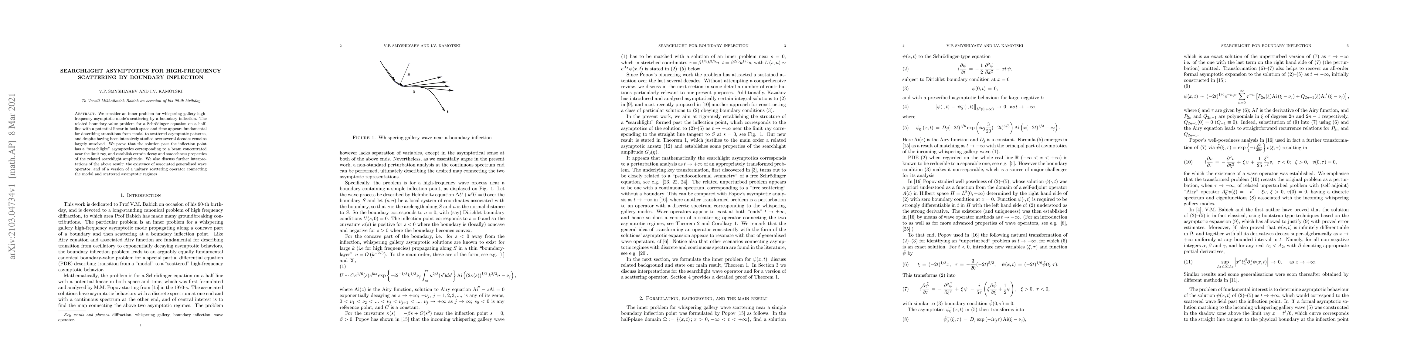 This paper investigates the high-frequency scattering of whispering gallery modes by a boundary inflection, proving that the solution exhibits "searchlight" asymptotics with a beam concentrated near the limit ray. It also establishes decay and smoothness properties of the searchlight amplitude and discusses the existence of generalized wave and unitary scattering operators.