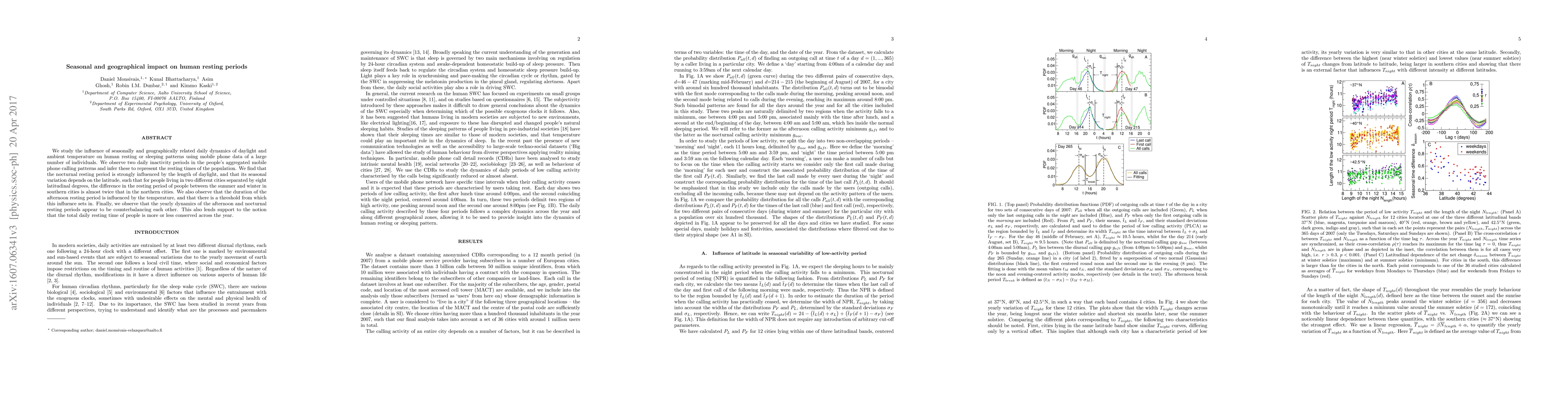 We study the influence of seasonally and geographically related daily dynamics of daylight and ambient temperature on human resting or sleeping patterns using mobile phone data of a large number of individuals. We observe two daily inactivity periods in the people's aggregated mobile phone calling patterns and infer these to represent the resting times of the population. We find that the nocturnal resting period is strongly influenced by the length of daylight, and that its seasonal variation depends on the latitude, such that for people living in two different cities separated by eight latitudinal degrees, the difference in the resting period of people between the summer and winter in southern cities is almost twice that in the northern cities. We also observe that the duration of the afternoon resting period is influenced by the temperature, and that there is a threshold from which this influence sets in. Finally, we observe that the yearly dynamics of the afternoon and nocturnal resting periods appear to be counterbalancing each other. This also lends support to the notion that the total daily resting time of people is more or less conserved across the year.