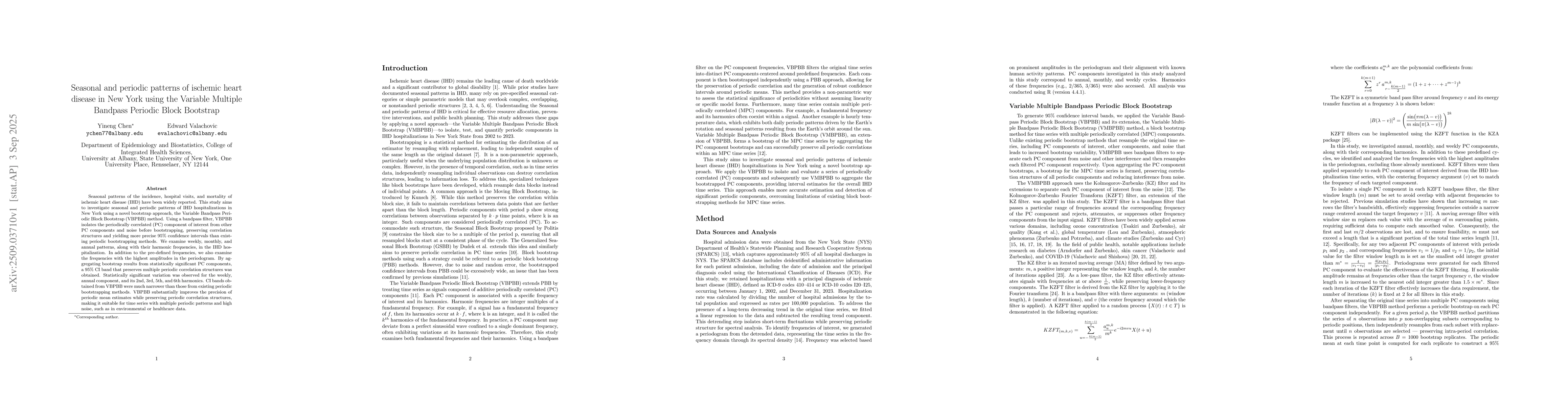 Seasonal patterns of the incidence, hospital visits, and mortality of ischemic heart disease (IHD) have been widely reported. This study aims to investigate seasonal and periodic patterns of IHD hospitalizations in New York using a novel bootstrap approach, the Variable Bandpass Periodic Block Bootstrap (VBPBB) method. Using a bandpass filter, VBPBB isolates the periodically correlated (PC) component of interest from other PC components and noise before bootstrapping, preserving correlation structures and yielding more precise 95\% confidence intervals than existing periodic bootstrapping methods. We examine weekly, monthly, and annual patterns, along with their harmonic frequencies, in the IHD hospitalization. In addition to the pre-defined frequencies, we also examine the frequencies with the highest amplitudes in the periodogram. By aggregating bootstrap results from statistically significant PC components, a 95\% CI band that preserves multiple periodic correlation structures was obtained. Statistically significant variation was observed for the weekly, annual component, and its 2nd, 3rd, 5th, and 6th harmonics. CI bands obtained from VBPBB were much narrower than those from existing periodic bootstrapping methods. VBPBB substantially improves the precision of periodic mean estimates while preserving periodic correlation structures, making it suitable for time series with multiple periodic patterns and high noise, such as in environmental or healthcare data.