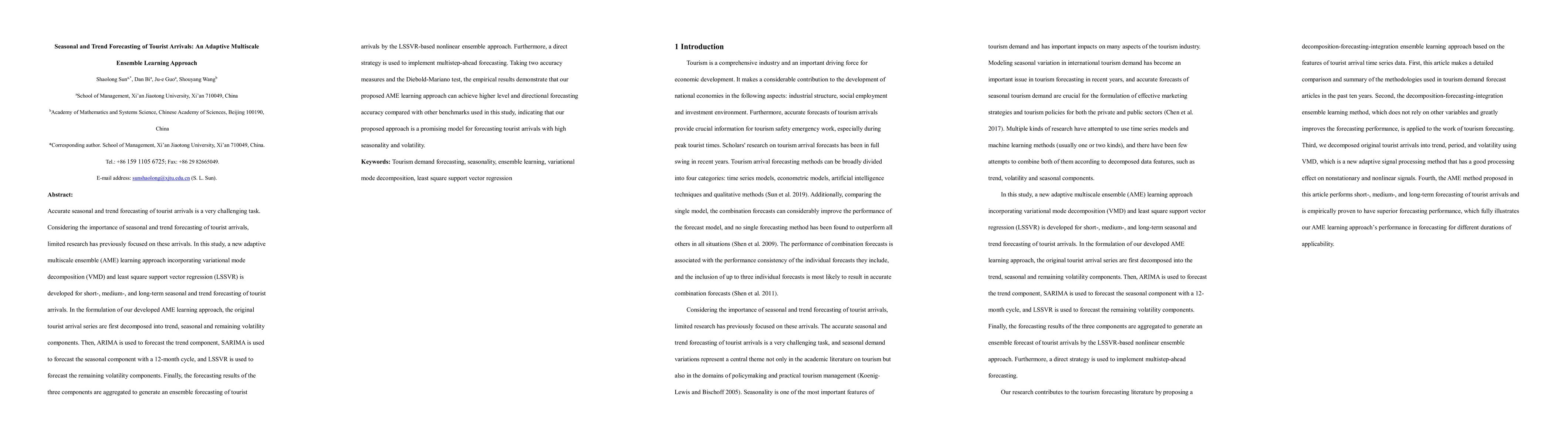 This paper proposes an adaptive multiscale ensemble (AME) learning approach for forecasting tourist arrivals, combining variational mode decomposition (VMD), ARIMA, SARIMA, and least square support vector regression (LSSVR). The method decomposes the arrivals data into trend, seasonal, and volatility components, then forecasts each separately and aggregates them for an ensemble forecast. The approach shows superior accuracy compared to benchmarks, indicating its effectiveness for high-seasonality tourism data.