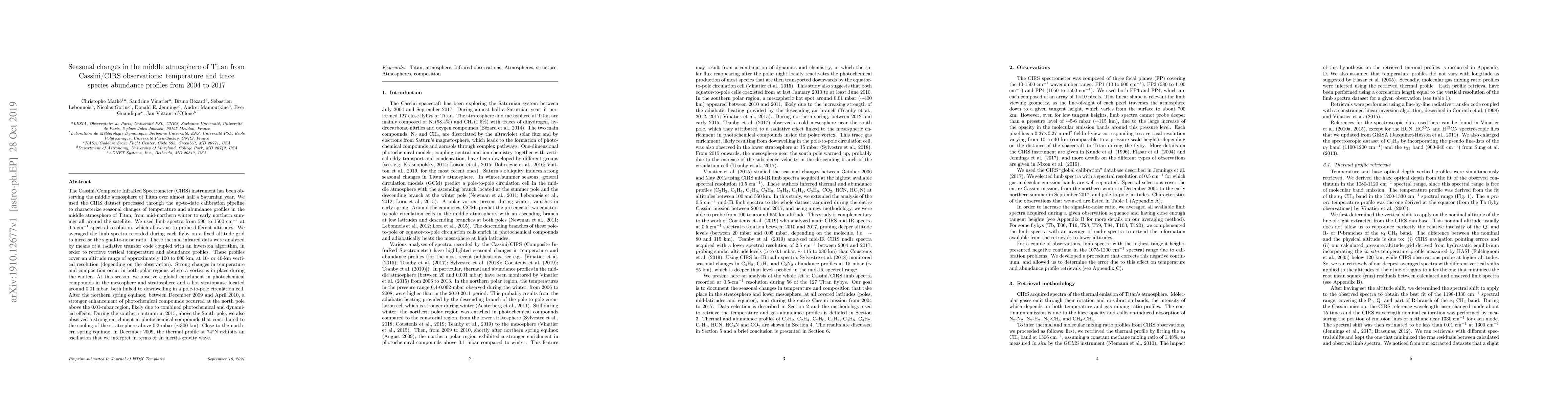 This study uses Cassini/CIRS observations to analyze seasonal changes in Titan's middle atmosphere from 2004 to 2017, revealing significant temperature and composition variations, especially in polar regions, with notable enhancements in photochemical compounds linked to seasonal shifts and circulation dynamics.