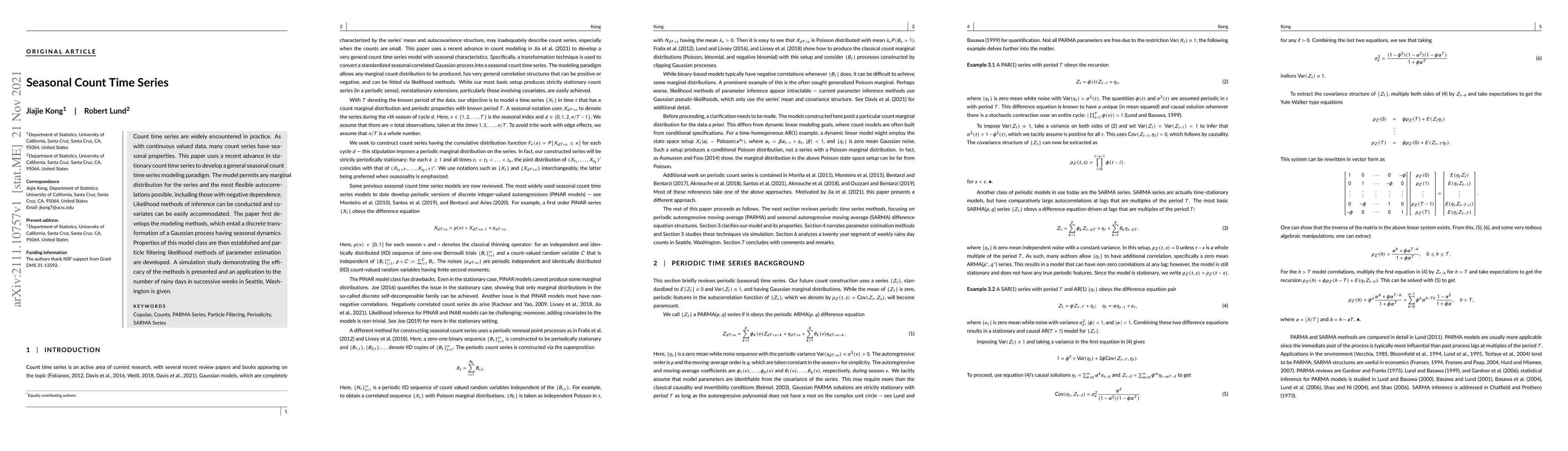 This paper develops a flexible modeling paradigm for seasonal count time series using a discrete transformation of a Gaussian process with seasonal dynamics, accommodating any marginal distribution and negative autocorrelations. It presents likelihood methods for inference and particle filtering for parameter estimation, demonstrated through a simulation study and an application to Seattle's weekly rainy days.