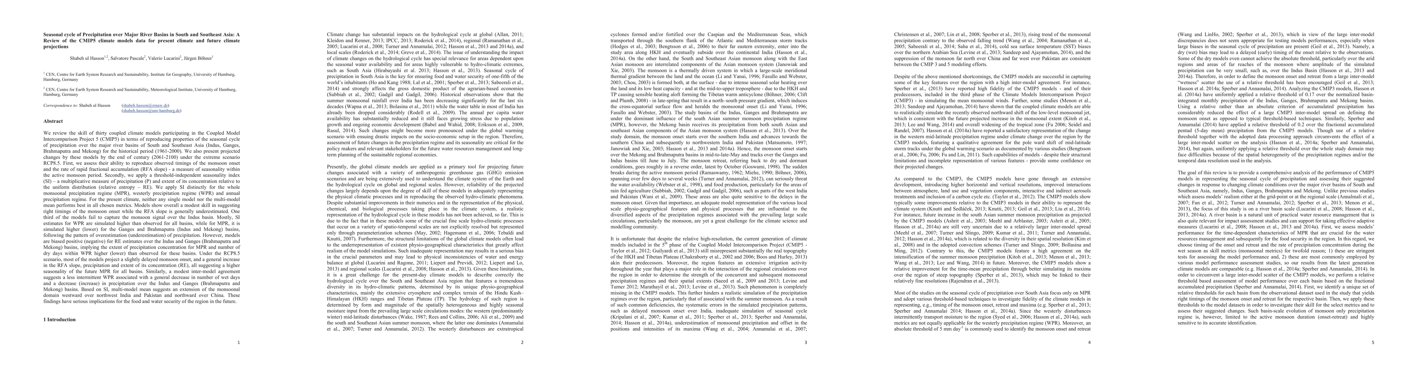 This paper reviews the performance of thirty CMIP5 climate models in simulating the seasonal cycle of precipitation over South and Southeast Asian river basins. It highlights that none of the models or the multi-model mean excels in all metrics, with most models underestimating the rate of rapid fractional accumulation and showing biases in seasonality indices. Under the RCP8.5 scenario, models project a delayed monsoon onset and increased precipitation intensity by the end of the century.