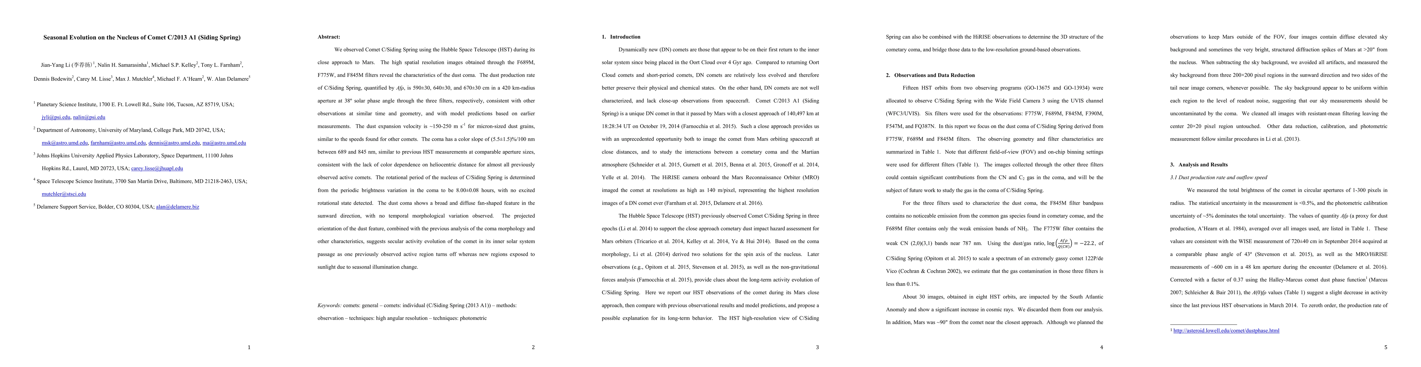 This study, using the Hubble Space Telescope, observes Comet C/2013 A1 (Siding Spring) during its Mars approach, revealing a dust production rate of 590-670 cm and a rotational period of 8.00±0.08 hours. The dust coma's morphology suggests seasonal evolution, with an active region turning off as new areas become illuminated.