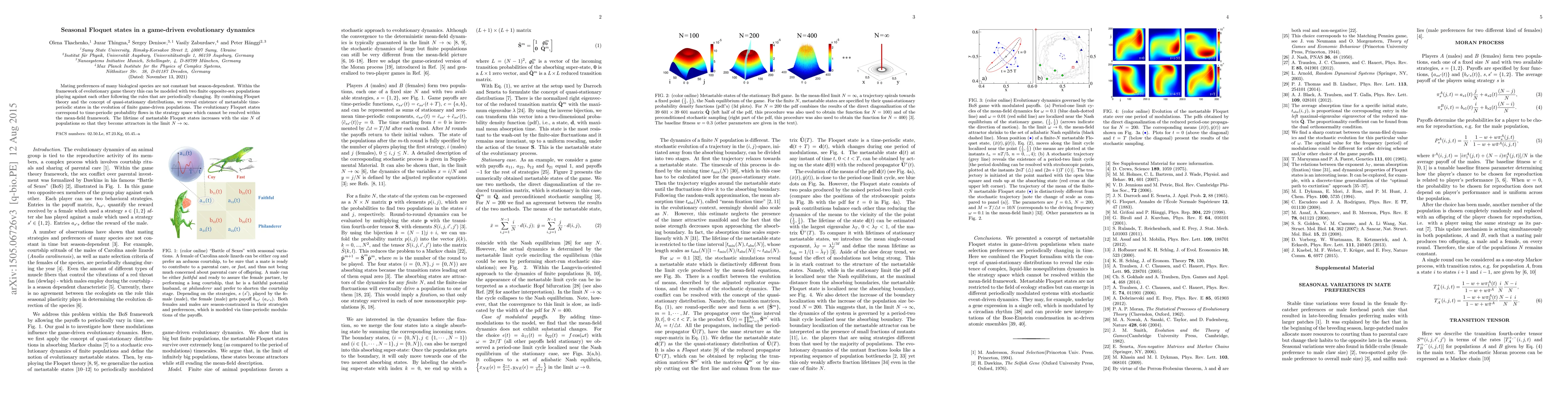 Mating preferences of many biological species are not constant but season-dependent. Within the framework of evolutionary game theory this can be modeled with two finite opposite-sex populations playing against each other following the rules that are periodically changing. By combining Floquet theory and the concept of quasi-stationary distributions, we reveal existence of metastable time-periodic states in the evolution of finite game-driven populations. The evolutionary Floquet states correspond to time-periodic probability flows in the strategy space which cannot be resolved within the mean-field framework. The lifetime of metastable Floquet states increases with the size $N$ of populations so that they become attractors in the limit $N \rightarrow \infty$.