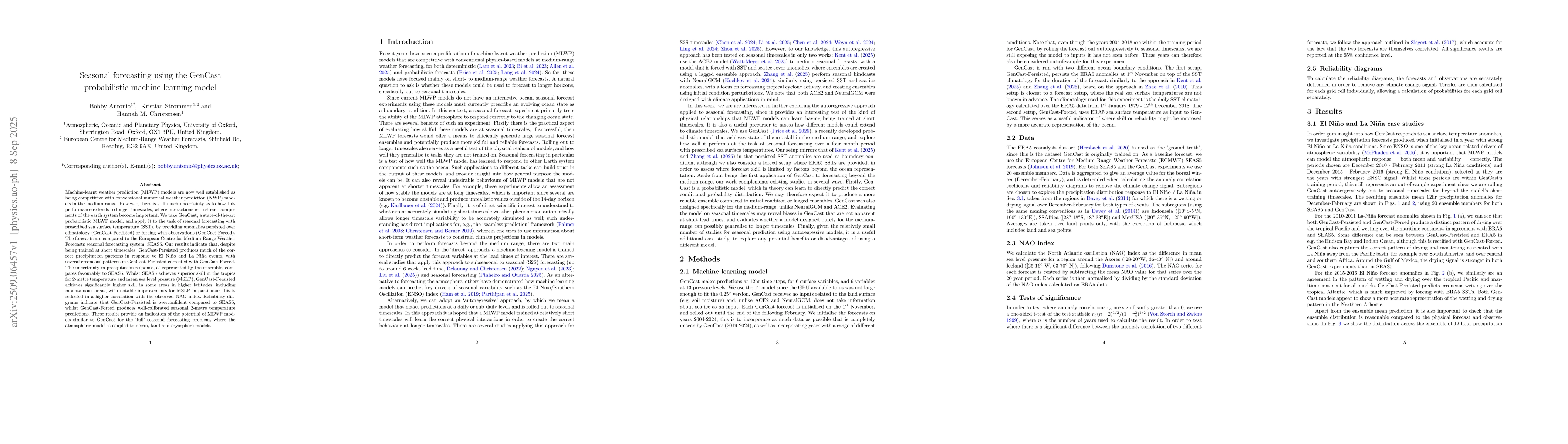 Machine-learnt weather prediction (MLWP) models are now well established as being competitive with conventional numerical weather prediction (NWP) models in the medium range. However, there is still much uncertainty as to how this performance extends to longer timescales, where interactions with slower components of the earth system become important. We take GenCast, a state-of-the-art probabilistic MLWP model, and apply it to the task of seasonal forecasting with prescribed sea surface temperature (SST), by providing anomalies persisted over climatology (GenCast-Persisted) or forcing with observations (GenCast-Forced). The forecasts are compared to the European Centre for Medium-Range Weather Forecasts seasonal forecasting system, SEAS5. Our results indicate that, despite being trained at short timescales, GenCast-Persisted produces much of the correct precipitation patterns in response to El Ni\~{n}o and La Ni\~{n}a events, with several erroneous patterns in GenCast-Persisted corrected with GenCast-Forced. The uncertainty in precipitation response, as represented by the ensemble, compares favourably to SEAS5. Whilst SEAS5 achieves superior skill in the tropics for 2-metre temperature and mean sea level pressure (MSLP), GenCast-Persisted achieves significantly higher skill in some areas in higher latitudes, including mountainous areas, with notable improvements for MSLP in particular; this is reflected in a higher correlation with the observed NAO index. Reliability diagrams indicate that GenCast-Persisted is overconfident compared to SEAS5, whilst GenCast-Forced produces well-calibrated seasonal 2-metre temperature predictions. These results provide an indication of the potential of MLWP models similar to GenCast for the `full' seasonal forecasting problem, where the atmospheric model is coupled to ocean, land and cryosphere models.