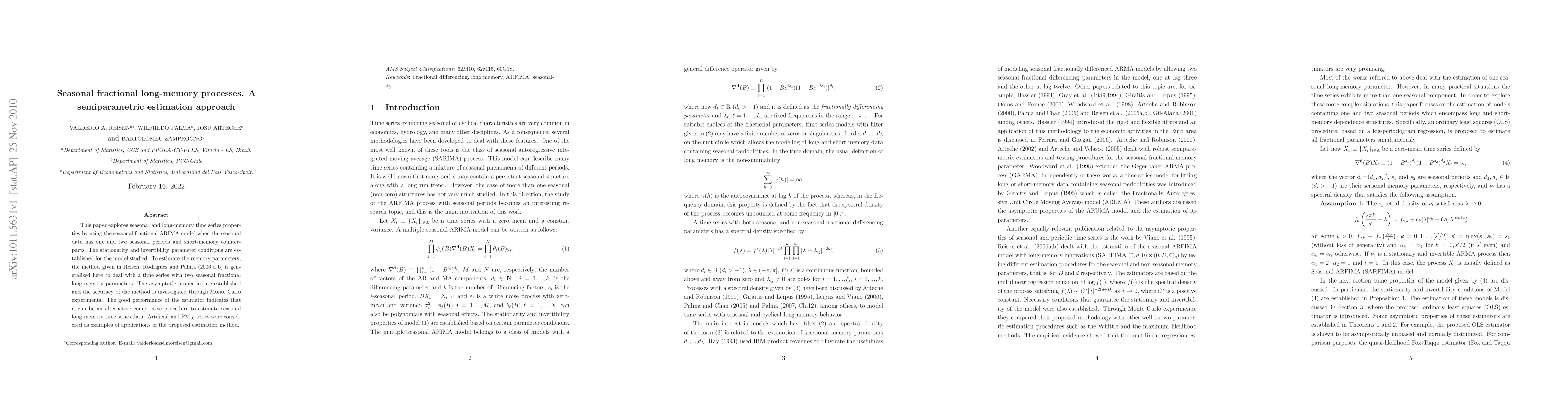 This paper explores seasonal and long-memory time series properties by using the seasonal fractional ARIMA model when the seasonal data has one and two seasonal periods and short-memory counterparts. The stationarity and invertibility parameter conditions are established for the model studied. To estimate the memory parameters, the method given in Reisen, Rodrigues and Palma (2006 a,b) is generalized here to deal with a time series with two seasonal fractional long-memory parameters. The asymptotic properties are established and the accuracy of the method is investigated through Monte Carlo experiments. The good performance of the estimator indicates that it can be an alternative competitive procedure to estimate seasonal long-memory time series data. Artificial and PM10 series were considered as examples of applications of the proposed estimation method.