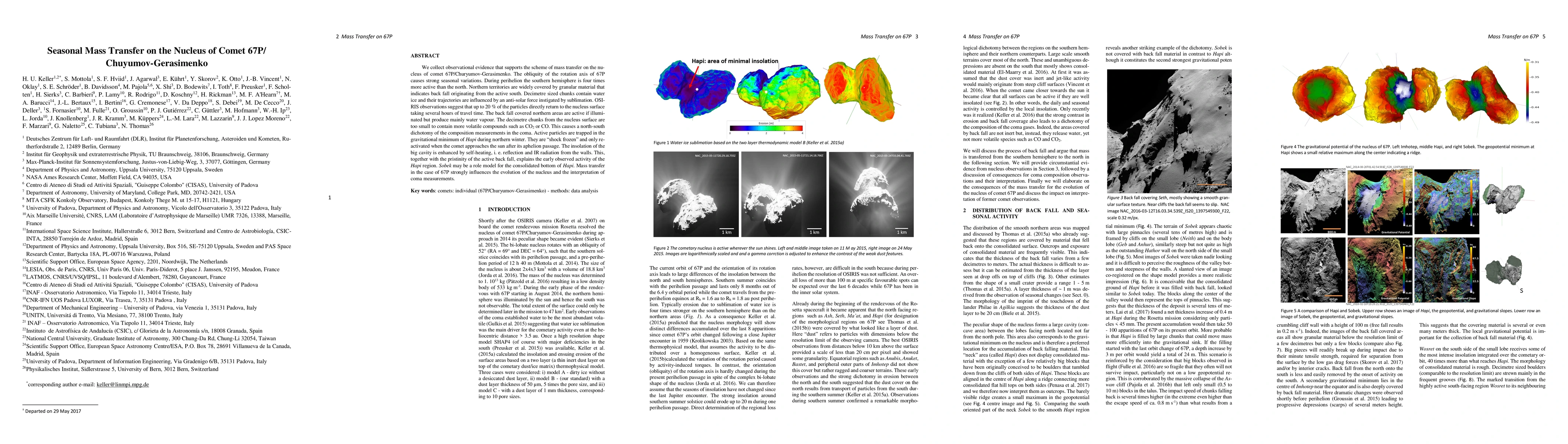 We collect observational evidence that supports the scheme of mass transfer on the nucleus of comet 67P/Churyumov-Gerasimenko. The obliquity of the rotation axis of 67P causes strong seasonal variations. During perihelion the southern hemisphere is four times more active than the north. Northern territories are widely covered by granular material that indicates back fall originating from the active south. Decimetre sized chunks contain water ice and their trajectories are influenced by an anti-solar force instigated by sublimation. OSIRIS observations suggest that up to 20 % of the particles directly return to the nucleus surface taking several hours of travel time. The back fall covered northern areas are active if illuminated but produce mainly water vapour. The decimetre chunks from the nucleus surface are too small to contain more volatile compounds such as CO 2 or CO. This causes a north-south dichotomy of the composition measurements in the coma. Active particles are trapped in the gravitational minimum of Hapi during northern winter. They are "shock frozen" and only reactivated when the comet approaches the sun after its aphelion passage. The insolation of the big cavity is enhanced by self-heating, i. e. reflection and IR radiation from the walls. This, together with the pristinity of the active back fall, explains the early observed activity of the Hapi region. Sobek may be a role model for the consolidated bottom of Hapi. Mass transfer in the case of 67P strongly influences the evolution of the nucleus and the interpretation of coma measurements.