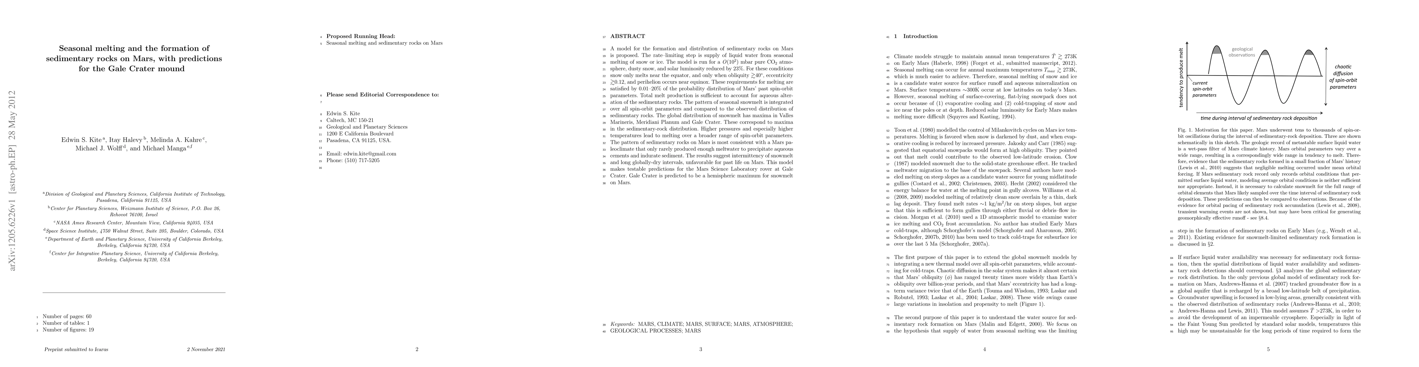 This paper proposes a model for sedimentary rock formation on Mars driven by seasonal melting of snow or ice, suggesting that such melting is rare and occurs only when specific spin-orbit conditions are met. The model predicts that Gale Crater is a significant site for snowmelt, supporting the hypothesis of intermittent meltwater availability and long dry periods, which may have implications for past life on Mars.