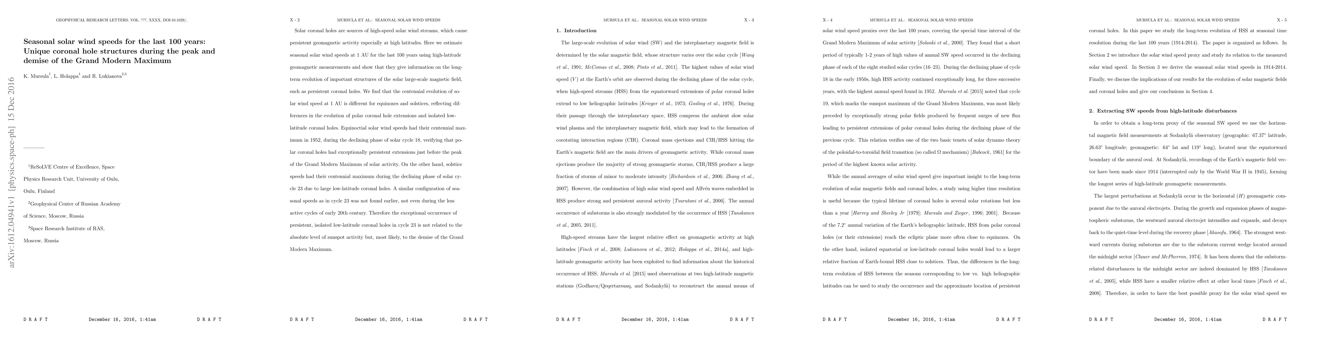 Solar coronal holes are sources of high-speed solar wind streams, which cause persistent geomagnetic activity especially at high latitudes. Here we estimate seasonal solar wind speeds at 1 AU for the last 100 years using high-latitude geomagnetic measurements and show that they give information on the long-term evolution of important structures of the solar large-scale magnetic field, such as persistent coronal holes. We find that the centennial evolution of solar wind speed at 1 AU is different for equinoxes and solstices, reflecting differences in the evolution of polar coronal hole extensions and isolated low-latitude coronal holes. Equinoctial solar wind speeds had their centennial maximum in 1952, during the declining phase of solar cycle 18, verifying that polar coronal holes had exceptionally persistent extensions just before the peak of the Grand Modern Maximum of solar activity. On the other hand, solstice speeds had their centennial maximum during the declining phase of solar cycle 23 due to large low-latitude coronal holes. A similar configuration of seasonal speeds as in cycle 23 was not found earlier, not even during the less active cycles of early 20th century. Therefore the exceptional occurrence of persistent, isolated low-latitude coronal holes in cycle 23 is not related to the absolute level of sunspot activity but, most likely, to the demise of the Grand Modern Maximum.