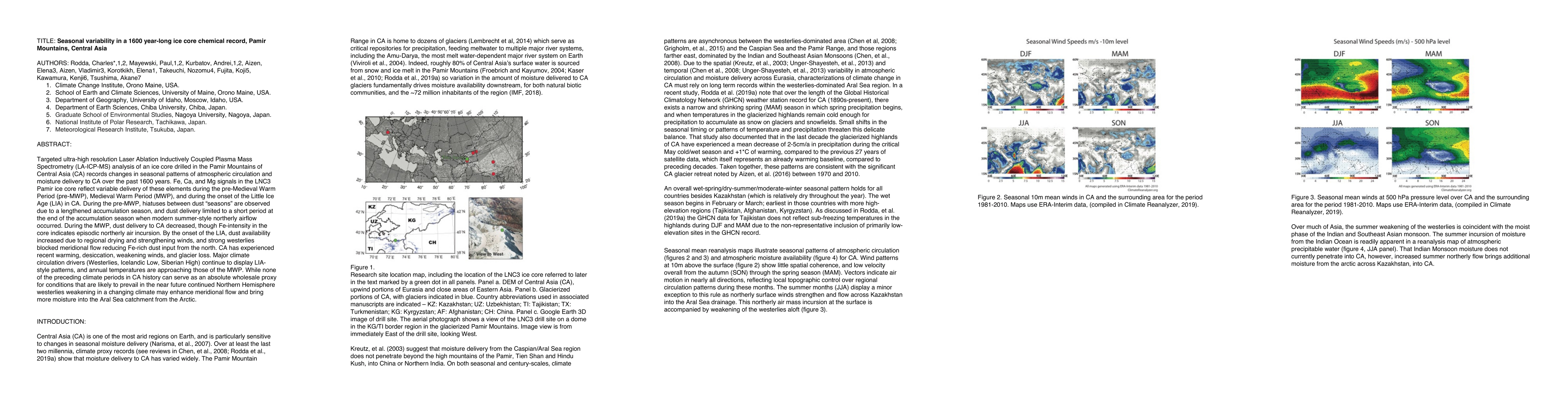 This study uses high-resolution ice core analysis from Pamir Mountains, Central Asia, to reveal seasonal atmospheric circulation and moisture delivery changes over 1600 years. It finds that pre-Medieval Warm Period saw lengthened accumulation and dust delivery in late season, while the Medieval Warm Period reduced dust input, and the Little Ice Age increased dust due to regional drying and stronger winds. Recent warming, desiccation, and glacier loss are noted, with potential future implications of weakening westerlies bringing more Arctic moisture into the Aral Sea catchment.