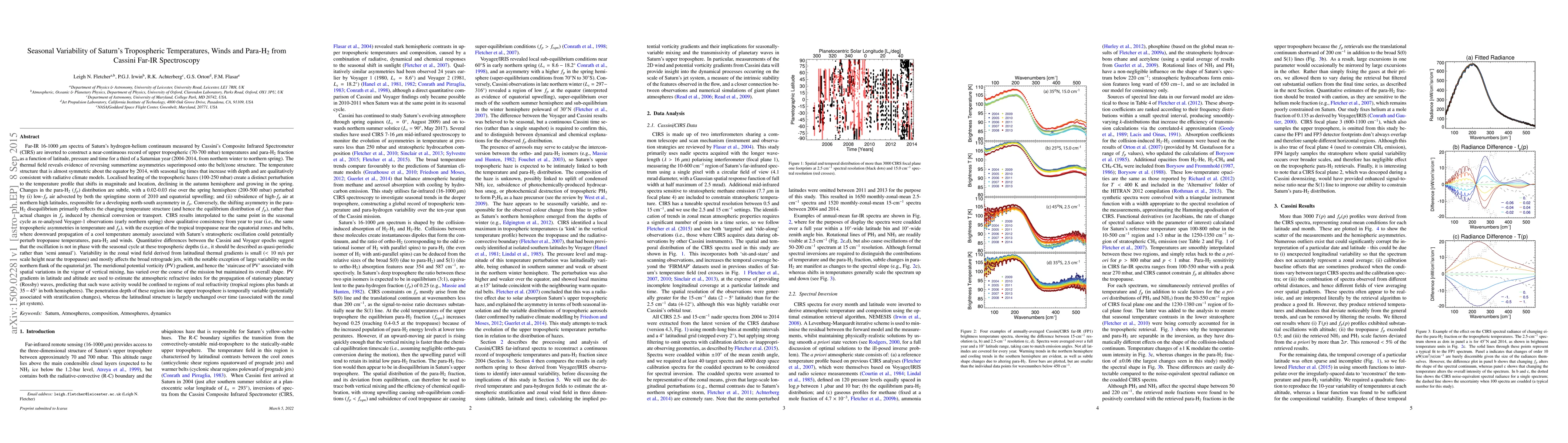 Researchers used Cassini's spectroscopy to study Saturn's tropospheric temperatures, winds, and para-H2, finding a symmetrical temperature structure around the equator with seasonal lag times that increase with depth, and subtle changes in para-H2 distribution.