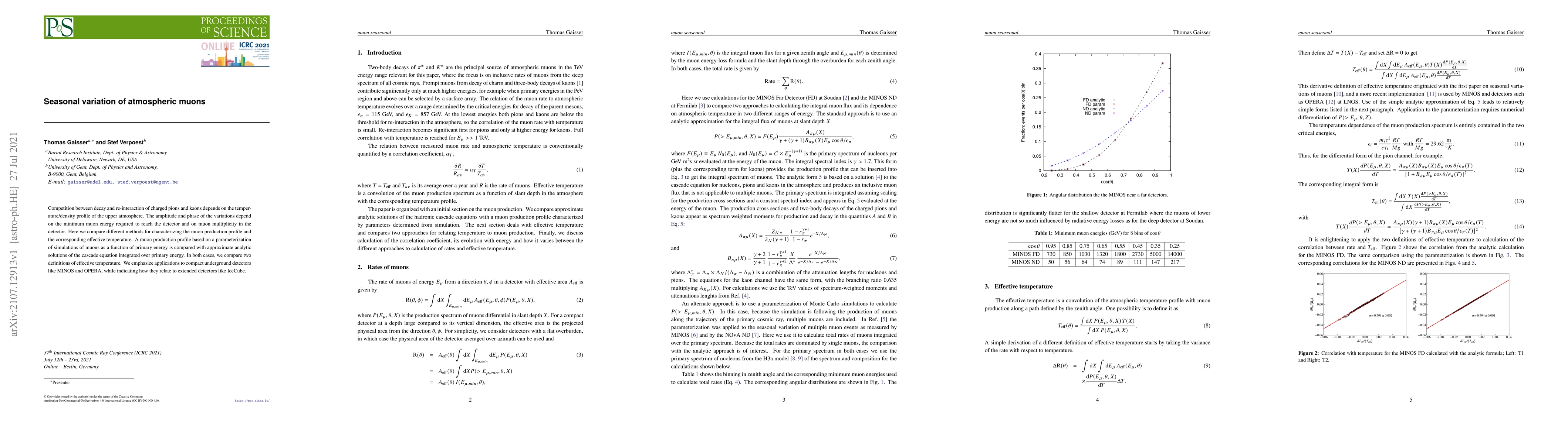 Competition between decay and re-interaction of charged pions and kaons depends on the temperature/density profile of the upper atmosphere. The amplitude and phase of the variations depend on the minimum muon energy required to reach the detector and on muon multiplicity in the detector. Here we compare different methods for characterizing the muon production profile and the corresponding effective temperature. A muon production profile based on a parameterization of simulations of muons as a function of primary energy is compared with approximate analytic solutions of the cascade equation integrated over primary energy. In both cases, we compare two definitions of effective temperature. We emphasize applications to compact underground detectors like MINOS and OPERA, while indicating how they relate to extended detectors like IceCube.