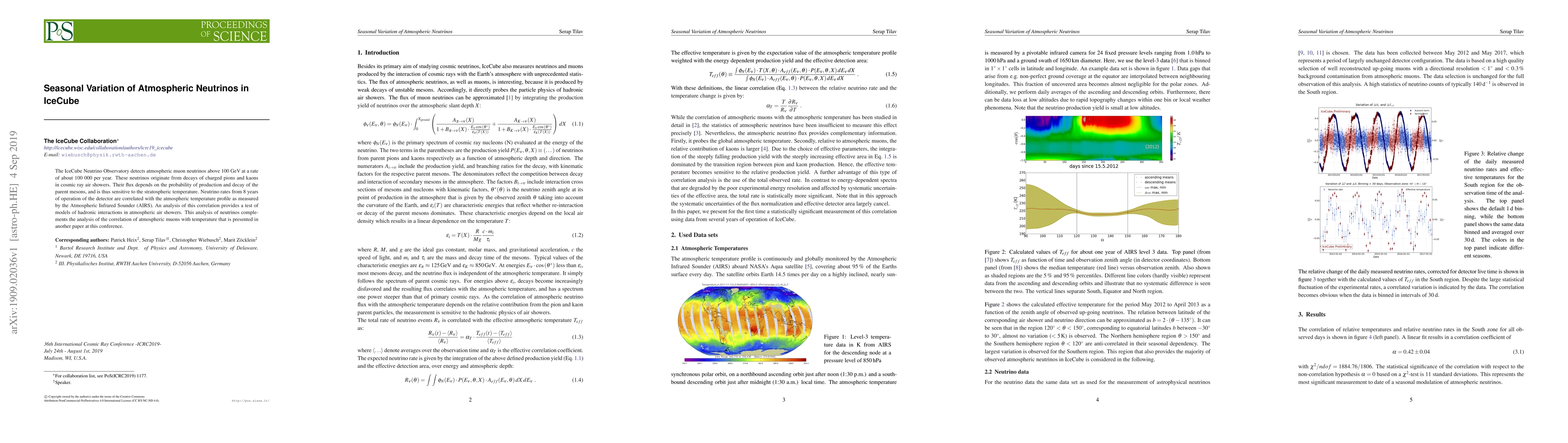 The IceCube Neutrino Observatory detects atmospheric muon neutrinos, revealing a seasonal variation correlated with stratospheric temperature measured by AIRS, providing insights into hadronic interaction models in cosmic ray showers. This study complements another analysis of atmospheric muons' temperature correlation.