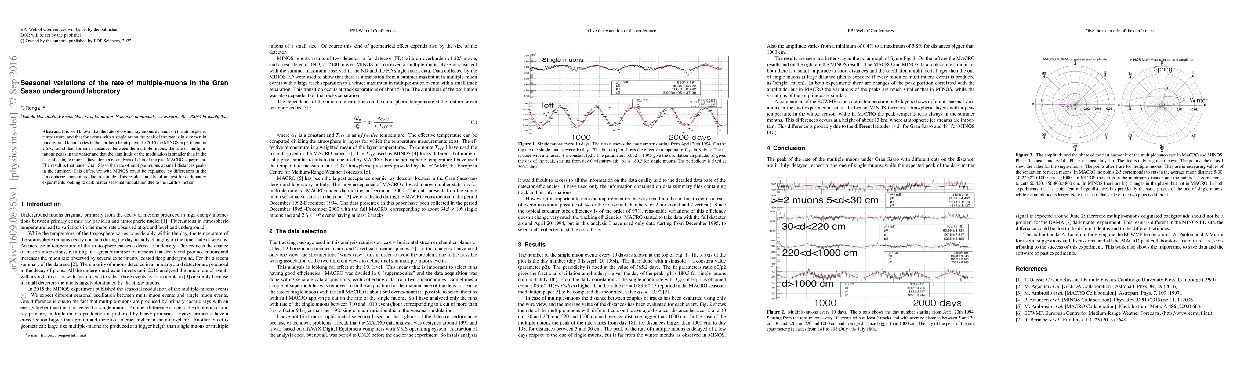 The study re-analyzes MACRO experiment data to find that the rate of multiple-muons at small distances in the Gran Sasso laboratory peaks in the summer, contrasting with the MINOS experiment's winter peak finding, potentially due to latitude-induced atmospheric temperature differences. This seasonal variation could be relevant for dark matter experiments assessing seasonal modulation.