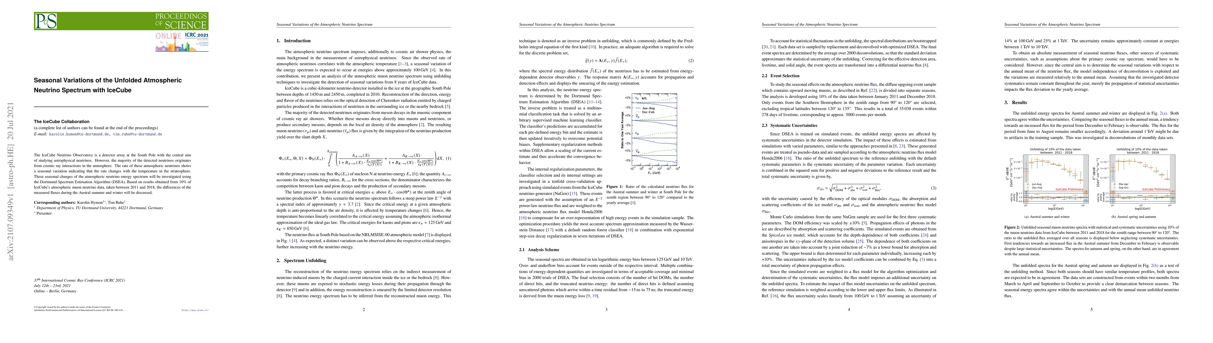 The IceCube Neutrino Observatory detects atmospheric neutrinos, whose rates show seasonal variations linked to stratospheric temperatures. This study uses the DSEA to analyze the seasonal changes in the atmospheric neutrino spectrum, revealing differences in measured fluxes between Austral summer and winter based on a decade of data.