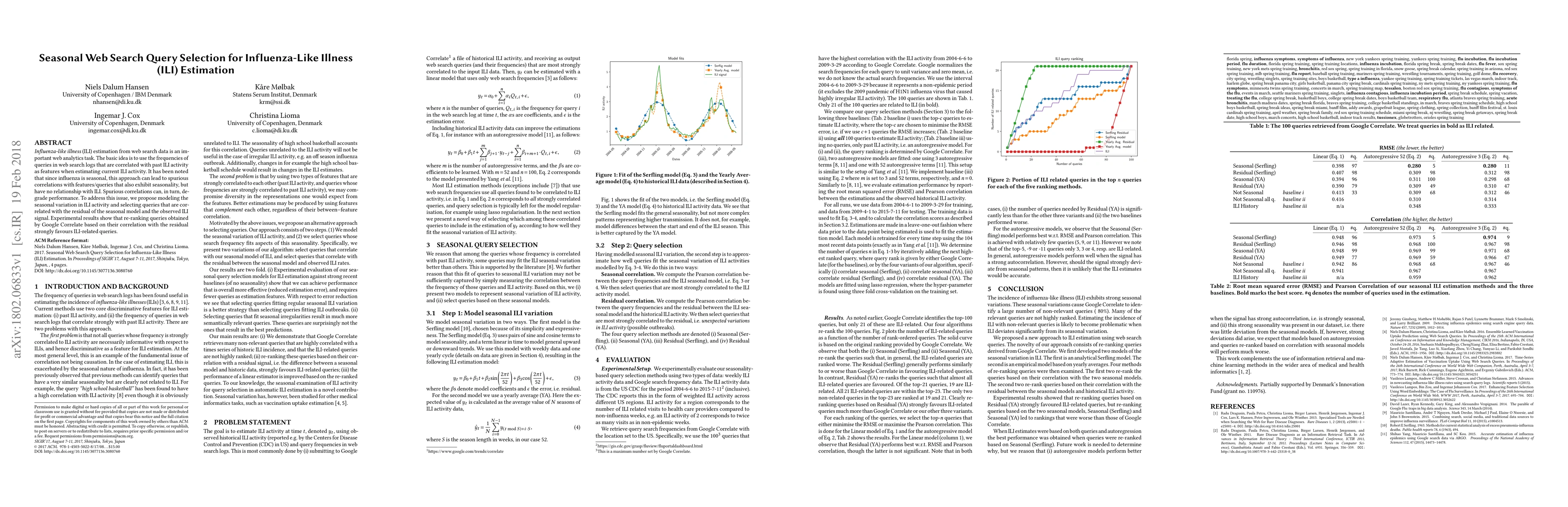 This paper proposes a method to estimate influenza-like illness (ILI) using web search queries, addressing the issue of spurious seasonal correlations by modeling ILI's seasonal variation and selecting queries correlated with the residual of this model. Experimental results demonstrate improved performance by re-ranking Google Correlate queries based on their correlation with the ILI residual.