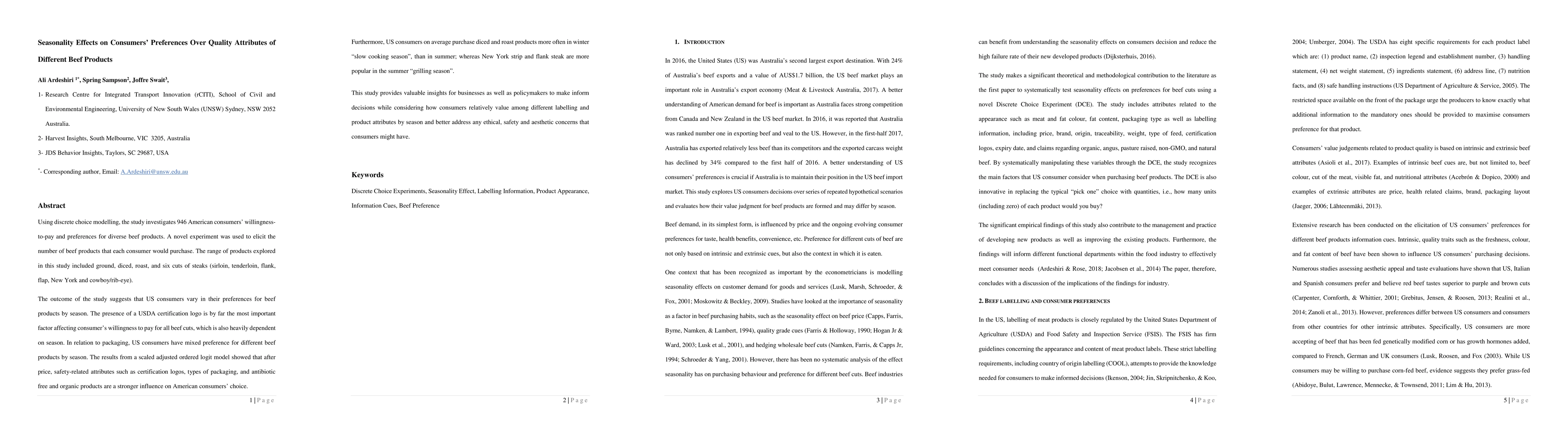 Using discrete choice modelling, the study investigates 946 American consumers willingness-to-pay and preferences for diverse beef products. A novel experiment was used to elicit the number of beef products that each consumer would purchase. The range of products explored in this study included ground, diced, roast, and six cuts of steaks (sirloin, tenderloin, flank, flap, New York and cowboy or rib-eye). The outcome of the study suggests that US consumers vary in their preferences for beef products by season. The presence of a USDA certification logo is by far the most important factor affecting consumers willingness to pay for all beef cuts, which is also heavily dependent on season. In relation to packaging, US consumers have mixed preference for different beef products by season. The results from a scaled adjusted ordered logit model showed that after price, safety-related attributes such as certification logos, types of packaging, and antibiotic free and organic products are a stronger influence on American consumers choice. Furthermore, US consumers on average purchase diced and roast products more often in winter slow cooking season, than in summer, whereas New York strip and flank steak are more popular in the summer grilling season. This study provides valuable insights for businesses as well as policymakers to make inform decisions while considering how consumers relatively value among different labelling and product attributes by season and better address any ethical, safety and aesthetic concerns that consumers might have.