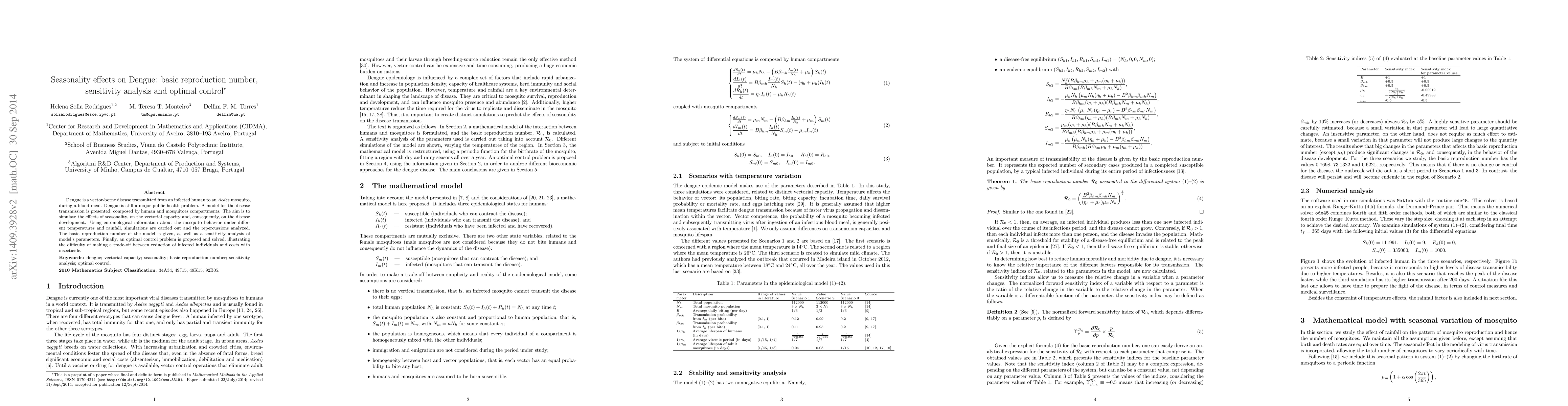 This paper models dengue transmission dynamics, focusing on seasonal effects on vectorial capacity and disease spread. It analyzes the basic reproduction number, conducts sensitivity analysis on model parameters, and proposes an optimal control strategy to balance infection reduction and insecticide costs.