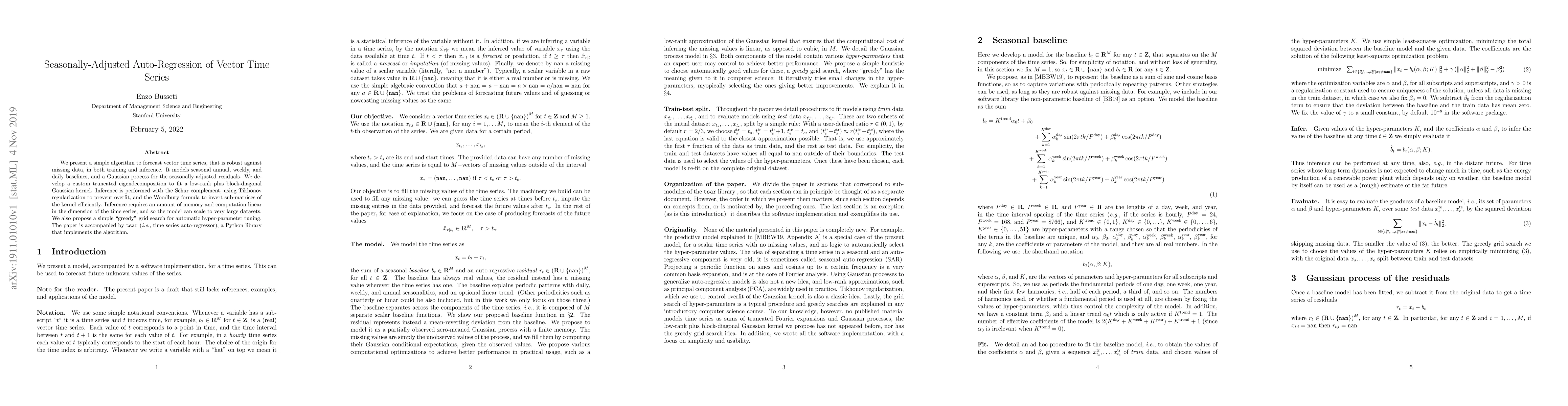 We present a simple algorithm to forecast vector time series, that is robust against missing data, in both training and inference. It models seasonal annual, weekly, and daily baselines, and a Gaussian process for the seasonally-adjusted residuals. We develop a custom truncated eigendecomposition to fit a low-rank plus block-diagonal Gaussian kernel. Inference is performed with the Schur complement, using Tikhonov regularization to prevent overfit, and the Woodbury formula to invert sub-matrices of the kernel efficiently. Inference requires an amount of memory and computation linear in the dimension of the time series, and so the model can scale to very large datasets. We also propose a simple "greedy" grid search for automatic hyper-parameter tuning. The paper is accompanied by tsar (i.e., time series auto-regressor), a Python library that implements the algorithm.