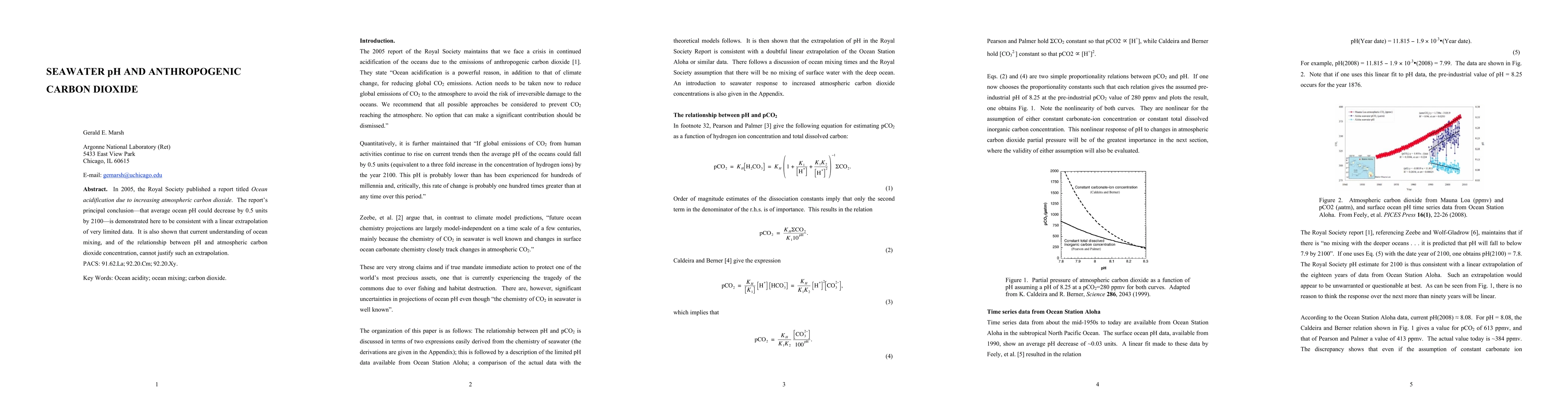 This paper critiques the Royal Society's 2005 report on ocean acidification, arguing that the predicted 0.5 unit pH decrease by 2100 is based on limited data and unsupported by current understanding of ocean mixing and the pH-CO2 relationship. The study suggests a need for more robust data to justify such predictions.