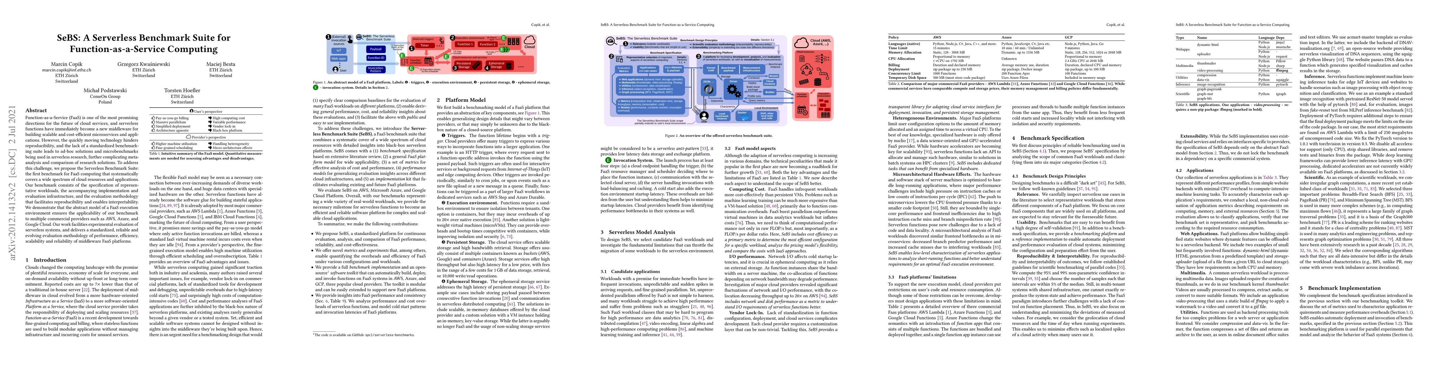 The paper introduces SeBS, the first standardized benchmark suite for Function-as-a-Service (FaaS) computing, addressing the lack of reproducibility in serverless research by providing a systematic evaluation methodology, representative workloads, and an implementation infrastructure. This suite aims to facilitate comparative analysis and meta-analysis of FaaS platforms across various cloud providers.