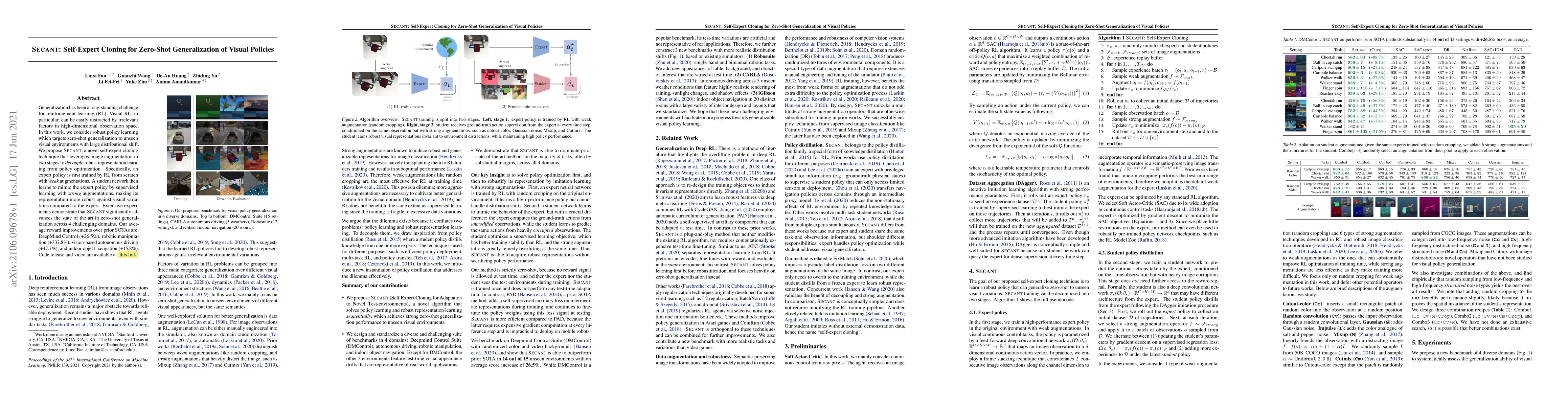 SECANT introduces a self-expert cloning technique for robust policy learning in visual reinforcement learning, achieving significant zero-shot generalization improvements across various domains. The method uses staged image augmentation to enhance representation robustness, outperforming previous state-of-the-art methods by substantial margins.