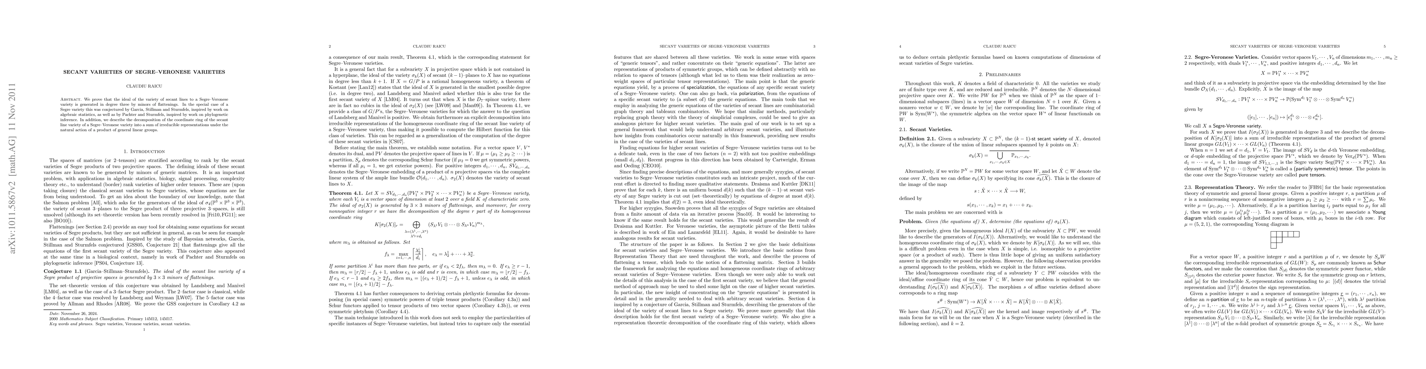 This paper proves that the ideal of secant lines to a Segre-Veronese variety is generated in degree three by minors of flattenings, verifying a conjecture for Segre varieties related to algebraic statistics and phylogenetic inference. It also details the decomposition of the coordinate ring of the secant line variety into irreducible representations under the action of general linear groups.