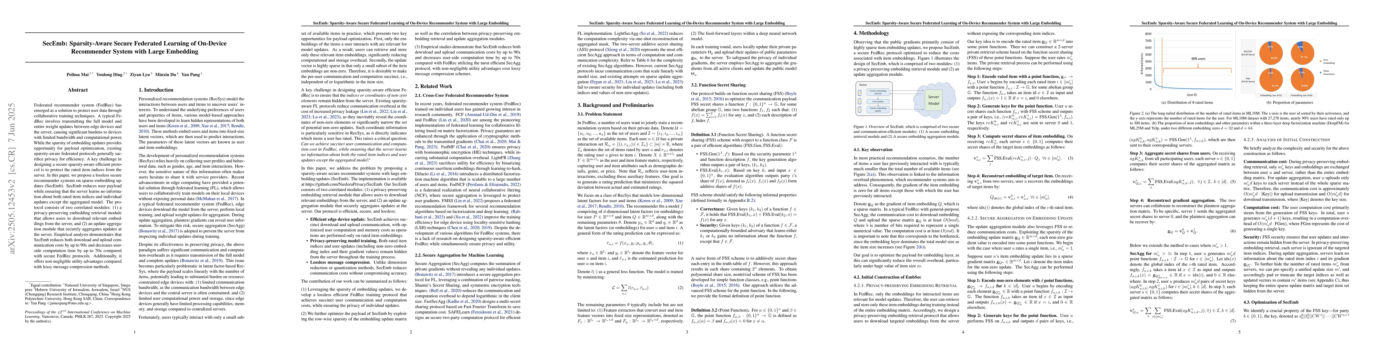 SecEmb, a sparsity-aware secure federated learning protocol for on-device recommender systems, which ensures privacy by preventing the server from learning individual user ratings while significantly reducing communication and computation costs.