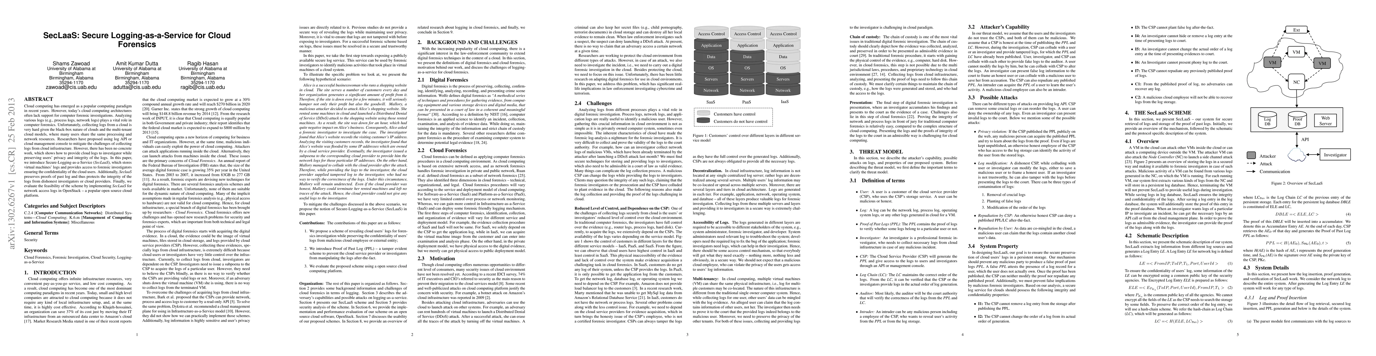 SecLaaS provides a secure logging service for cloud forensics, storing virtual machine logs to protect users' privacy while preserving the integrity of the logs.