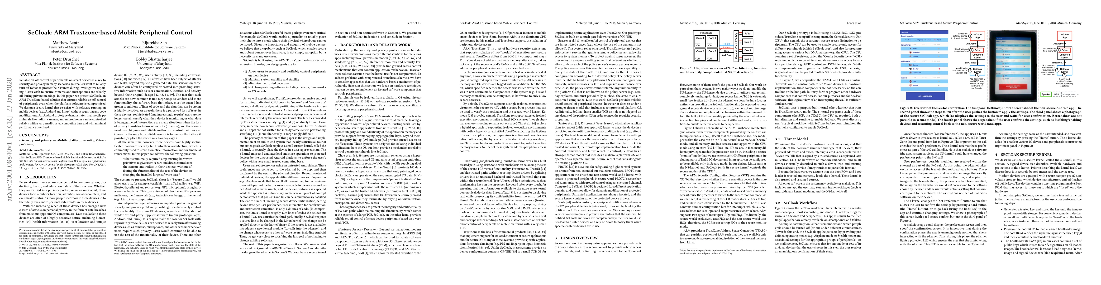 SeCloak is an ARM TrustZone-based solution for reliable on-off control of mobile device peripherals, ensuring security and privacy even when platform software is compromised. It achieves this through a secure kernel that co-exists with existing software without requiring modifications, demonstrated effectively in an Android prototype.