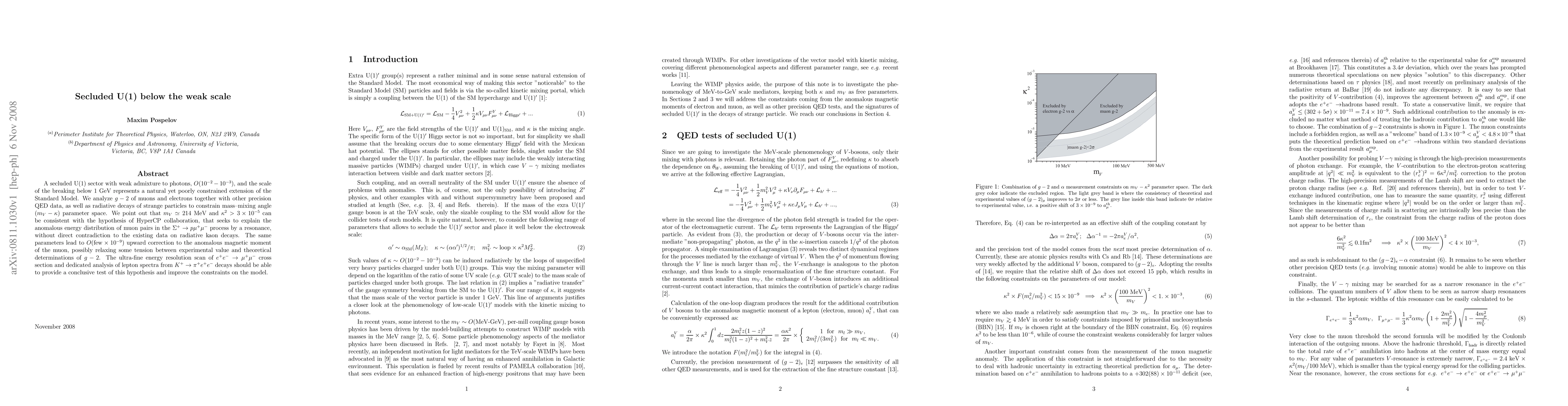 A secluded U(1) sector with weak admixture to photons, O(10^{-2}-10^{-3}), and the scale of the breaking below 1 GeV represents a natural yet poorly constrained extension of the Standard Model. We analyze g-2 of muons and electrons together with other precision QED data, as well as radiative decays of strange particles to constrain mass--mixing angle (m_V-\kappa) parameter space. We point out that m_V = 214 MeV and \kappa^2 > 3\times 10^{-5} can be consistent with the hypothesis of HyperCP collaboration, that seeks to explain the anomalous energy distribution of muon pairs in the \Sigma^+ \to p \mu^+\mu^- process by a resonance, without direct contradiction to the existing data on radiative kaon decays. The same parameters lead to O({\rm few} \times 10^{-9}) upward correction to the anomalous magnetic moment of the muon, possibly relaxing some tension between experimental value and theoretical determinations of g-2. The ultra-fine energy resolution scan of e^+e^-\to \mu^+\mu^- cross section and dedicated analysis of lepton spectra from K^+\to \pi^+ e^+e^- decays should be able to provide a conclusive test of this hypothesis and improve the constraints on the model.